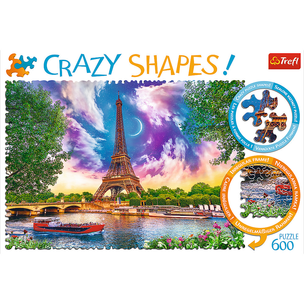 Puzzle - 600 őrült forma - Ég Párizs felett 11115 Az Őrült alakzatok! a világ legőrültebb puzzle-sorozata, amelyben: a kirakók őrült, nem szabványos formájúak, nincsenek egyenes vonalak, a kép széle csavart és egyenetlen. A kirakó 600 darabból áll, összerakás után egy 680 x 480 mm méretű képet hoz létre, amely Párizs feletti eget ábrázolja. A termék kiváló minőségű anyagokból készült, speciális, fényt visszaverő, kalanderezett papír felhasználásával, ami megkönnyíti az összeszerelést.