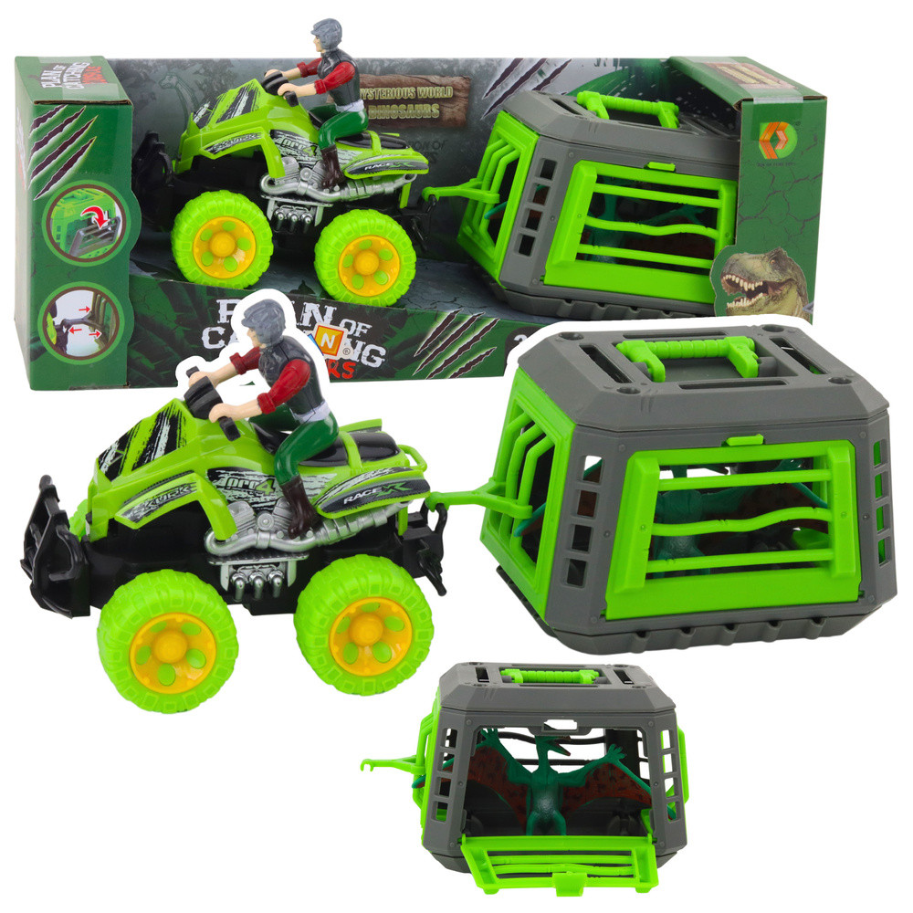QUAD VEZETŐVEL ÉS DINÓKETRECCEL Egy ketreces és vezetőfigurás quad egy izgalmas játék, amely elrepíti a gyermeket egy rendkívüli kalandok világába - egyenesen a vad dzsungelbe, tele veszélyes dinoszauruszokkal és lenyűgöző felfedezésekkel. A színes, terepjárót nagy, kifejező kerekekkel a dinamikus játékot szem előtt tartva tervezték - otthon és azon kívül egyaránt. A rögzített ketrecnek köszönhetően a kisgyermek az őskori hüllők bátor vadászának szerepét öltheti magára, és biztonságos helyre szállíthatja az elfogott dinoszauruszt. A készlet nemcsak egy masszív quadot tartalmaz rögzített ketreccel, hanem egy védősisakban lévő vezetőfigurát és egy dinoszaurusz figurát is, amelyek együttesen egy koherens jelenetet alkotnak, amely azonnal játékra kész. A játék tartós, sérülésálló műanyagból készült, így még a legkisebbek intenzív használatára is alkalmas. Ez egy nagyszerű választás azoknak a gyerekeknek, akiket érdekel a dinoszauruszok, a járművek világa, és szeretnek kreatívan szerepeket játszani. A készlettel való játék nemcsak szórakoztató, hanem támogatja a motoros koordináció, a térbeli képzelet és a kézügyesség fejlődését is. SPECIFIKÁCIÓ: • A készlet méretei: 29,5 cm x 13,5 cm x 10 cm • A csomagolás méretei: 35,5 cm x 12,5 cm x 11 cm • Anyag: műanyag • Mozgatható elemek: ketrec, kerekek, sofőr figura A SZETT TARTALMA: • Terepjáró quad • Mozgatható ketrec dinoszaurusznak • Vezető figura • Dinoszaurusz figura