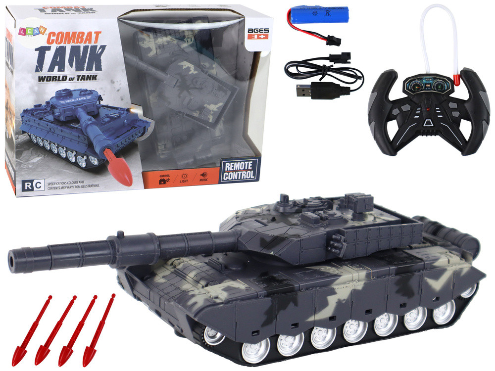 Távirányítású Távirányítású Tank Katonai Jármű Moro   A játék egy távirányítású távirányítású tank, amely egy valódi tank pontos másolata. A színséma domináns színei az álcázás, a szürke, a fekete és a bézs, ami realisztikus megjelenést kölcsönöz neki. A tankot gondosan tervezték, hogy a lehető legjobban utánozza az igazi tankot. Láthatóak az összes jellegzetes elem, mint például a lánctalp, a cső, a torony és egyéb részletek. A tank 360 fokban elforgatható tornyommal rendelkezik. Ennek a funkciónak köszönhetően pontosan irányíthatod a tank működését különböző irányokba. A jármű hang- és fényfunkciókkal van felszerelve, amelyek realisztikussá teszik. A tank működési és lövési hangjai és fényei azt a benyomást keltik, mintha valóban egy erős harcjárművet irányítanál. A tank csövét két lámpa világítja meg, ami még realisztikusabb megjelenést kölcsönöz neki, és lehetővé teszi a pontos célzást. A készlet négy lövedéket tartalmaz, amelyek a tank csövéből lőhetők ki. Ez versenyelemet ad a játékhoz, és lehetővé teszi a célpontok "kilövését". A készlet tartalmaz egy távirányítót, amellyel a tank mozgását irányíthatod. Jobbra, balra, előre és hátra is irányíthatod, így teljes mértékben uralhatod a játékot. Ez a távirányítós tank tökéletes játék a katonai rajongók és a modellezés szerelmeseinek. Realisztikus megjelenésének és számos funkciójának köszönhetően sok órányi izgalmas szórakozást nyújt.   Műszaki adatok: - tápegység: 800mAh akkumulátor - akkumulátor üzemidő: akár 30 perc - töltési idő: akár 180 perc - távirányító hatótávolsága: akár 15 m - frekvencia 27 MHz   A készlet tartalma: - tank - távirányító - 800 mAh akkumulátor - eredeti csomagolás   Tank méretei: 30 cm x 11 cm x 8 cm   A csomag mérete: 35 cm x 24 cm x 10 cm   A távirányítót két 1,5 V-os AA elem táplálja, amelyek nem részei a készletnek.   CE tanúsítvánnyal rendelkezik és megfelel az EN71 szabványnak. A játék 3 év feletti gyermekek számára készült.