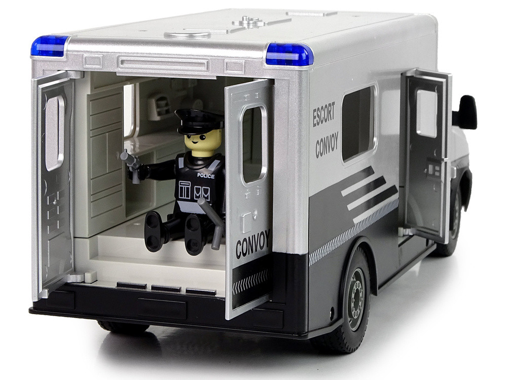 Távirányítású Biztonsági Jármű 1:18 méretarányú Biztonsági Konvoj Bankautó + 2,4 GHz-es távirányító   A SECURITY CONVOY különleges erők járműve egy gyönyörűen reprodukált és a legpontosabb jármű, amely a különleges erők műveleteiben található. Használható pénz, banditák szállítására vagy különleges akciók végrehajtására. A jármű LED-es lámpákkal és világító kakasokkal van felszerelve a tetején, ami fokozza a szórakozást. Az autó nyitható raktérrel és oldalsó ajtókkal rendelkezik, így bármit bepakolhatsz, amit csak szeretnél. Egy rendőr figura bottal és pisztollyal teszi még vonzóbbá a játékot. A fényeffektusok mellett az autó hangeffektusokat is kiad. Az autót egy 2,4 GHz-en működő távirányítóval lehet irányítani. Az autót egy újratölthető akkumulátor táplálja, amely USB-kábelen keresztül tölthető (a készlet tartalmazza).   A készlet tartalma: - Biztonsági Különleges Szolgálatok Autója - Távirányító - Rendőr figura pisztollyal és bottal - Újratölthető akkumulátor - USB töltő Ez a játék fejleszti gyermeked kreativitását és fantáziáját! Lehetővé teszi számos veszélyes rendőri akció végrehajtását!   Jármű méretei: 33 cm x 14 cm x 11,5 cm Csomagolás méretei: 44 cm x 23 cm x 18 cm