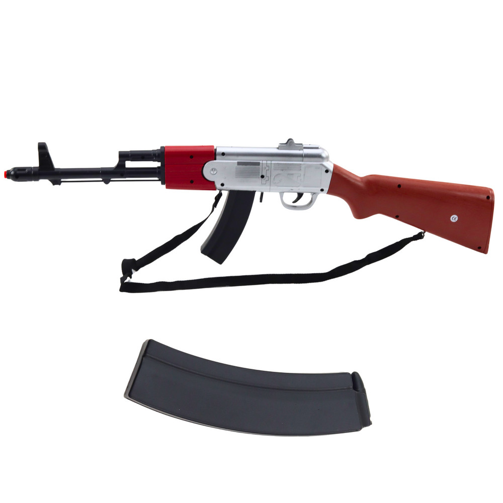 BARNA SÖTÉTPUSKA HANGJAI Egy nagyméretű, valósághű játékpuska nagyszerű ajánlat gyerekeknek és a fegyverreplikák szerelmeseinek. A legendás modellek ihlette klasszikus dizájnnak köszönhetően a játék rendkívül lenyűgözőnek tűnik, és rengeteg szórakozást nyújt játék közben. A puska nem lő golyókat - csak hangokat ad ki, így teljesen biztonságos mind a legkisebbek, mind a kellékként használók számára. A játék kivehető tárral van felszerelve, ami növeli a realizmust és még lebilincselőbb játékot tesz lehetővé. A fahatású tus és a fémes felületkezelésű elemek hiteles megjelenést kölcsönöznek neki. Ezenkívül a mellékelt vállpánt kényelmes viseletet biztosít a puskának, ami tökéletes tematikus játékokhoz és színpadra állításokhoz. Tökéletes kellék színházi előadásokhoz, történelmi színpadra állításokhoz, fotózásokhoz, valamint katona vagy kommandós szerepléséhez. Realisztikus kidolgozásának és részleteinek köszönhetően mind a gyerekek, mind a felnőttek számára vonzó lesz. SPECIFIKÁCIÓ: Játék típusa: Realisztikus játékpuska Hatások: Lövési hangokat ad ki (lövedékek kilövellése nélkül) További funkciók: Kivehető tár Szín: Fekete és ezüst fa színű elemekkel Anyag: Tartós műanyag Méretek: 65 cm A KÉSZLET TARTALMA: Játékpuska Kivehető tár Vállpánt