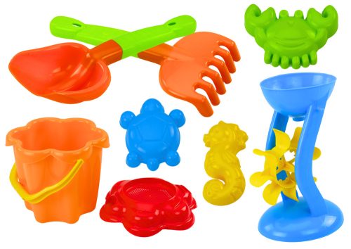 Homokkészlet, vödör, daráló, szűrő, formák, 9 színes