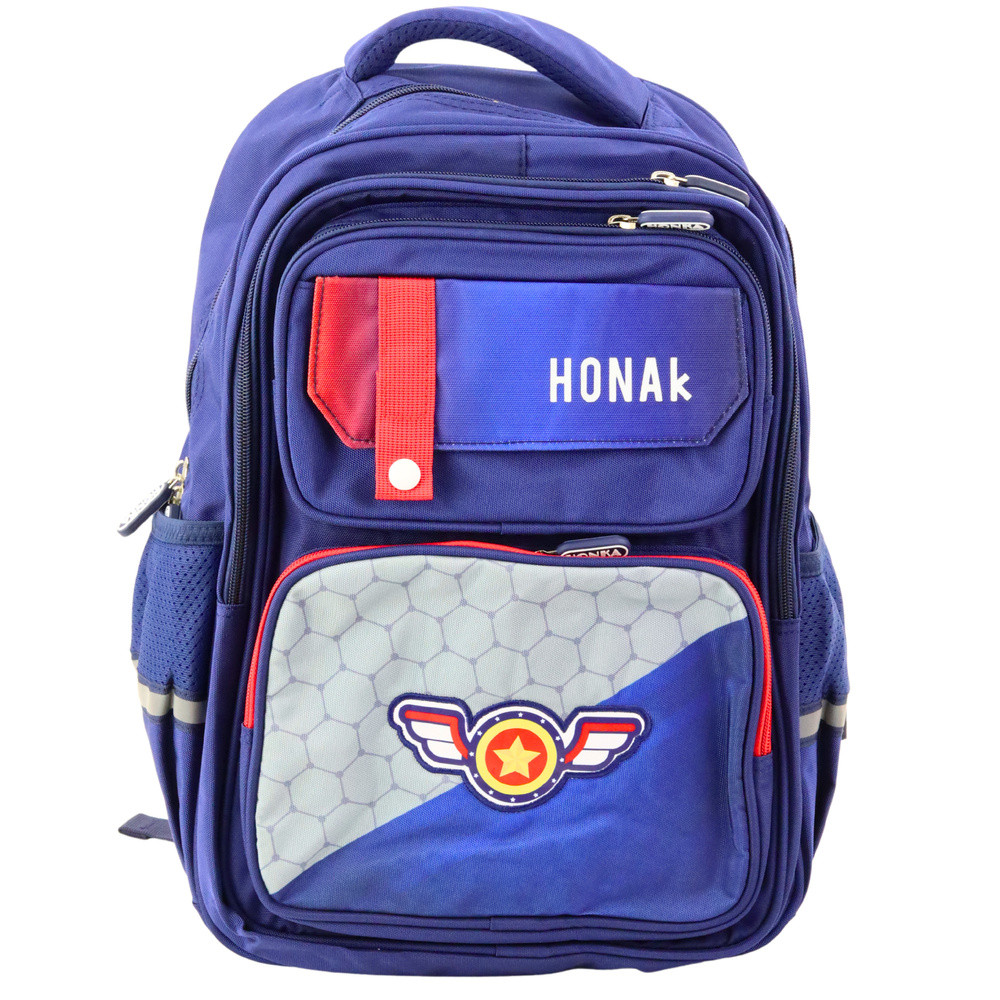 ISKOLAI HÁTIZSÁK TENGERÉSZKÉK FOLTOKKAL Tartós és tágas iskolai hátizsák, amelyet gyermekek és fiatalok mindennapi használatra terveztek. Modern színek és dinamikus részletek - mint például a szárny és a csillag motívum - kiemelik a hátizsákot a többi modell közül, a funkcionalitást érdekes dizájnnal ötvözve. A modell két tágas rekesszel van felszerelve, amelyek közül a fő egy válaszfallal rendelkezik, amely megkönnyíti a könyvek és füzetek rendszerezését. A hátizsák elején három további cipzáras zseb található - ideálisak apró kiegészítők, tolltartó vagy uzsonnásdoboz számára. Két rugalmas oldalsó zseb jól funkcionál palack vagy vizespalack tárolására. A nagyobb kényelem érdekében a hátizsák puha hátrésszel, mellkasi pánttal és fényvisszaverő elemekkel van felszerelve, amelyek javítják a gyermek láthatóságát sötétedés után. SPECIFIKÁCIÓ: Hátizsák méretei: 41 x 30 x 16 cm Űrtartalom literben: 20L Anyag: Tartós szintetikus szövet Zsebek száma: 7 (2 rekesz, 3 elülső zseb, 2 oldalsó zseb) Hordozórendszer: Puha hátrésszel, állítható pántokkal, mellkasi pánttal További jellemzők: Csillag és szárny motívum, fényvisszaverő elemek A SZETT TARTALMA: Iskolai hátizsák két rekesszel
