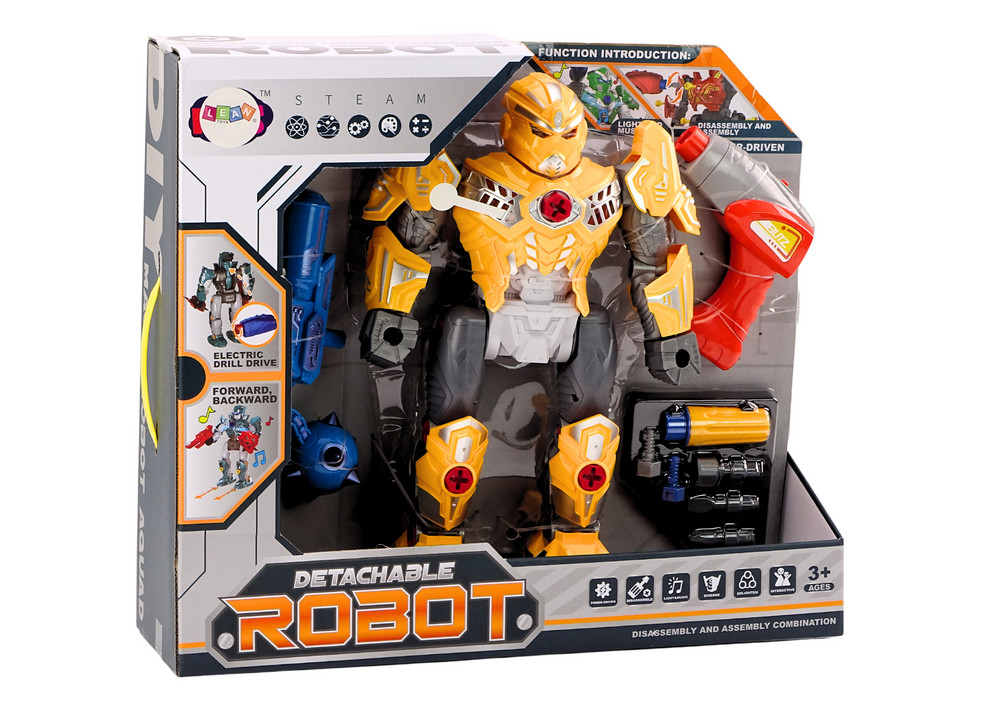 Csavarozó Robot Fegyver Fúró Csavarhúzó Fény Hang Sárga A csodálatos sárga forgó robot egy fejlett játék, amely minden gyermek számára örömet okoz. Tartós és masszív anyagból készült, így garantáltan hosszú élettartamú és biztonságos játékot biztosít. A robotot a gyermekek kézügyességének, motoros koordinációjának és logikus gondolkodásának fejlesztésére tervezték. A robot egyik kulcsfontosságú funkciója a csavarás és csavarozás képessége, amely lehetővé teszi a gyermek számára, hogy egy kis mérnök szerepét játssza el, és megtanulja az egyszerű mechanizmusok működési elveit. A készlet tartalmaz egy fúrót és egy csavarhúzót, amelyek a gyermekek kis kezéhez igazodnak, ami megkönnyíti a robot elemeinek kezelését. Három cserélhető hegy teszi még változatosabbá a szórakozást. A robot ököllel és egy kék fegyverrel van felszerelve, ami fantasztikus kalandelemet ad a játékhoz. A gyermek elképzelheti, hogy a robot ellenségekkel harcol, vagy különleges küldetéseket hajt végre, ami fejleszti kreativitását és narratív készségeit. A robot összeszerelése után a fúró akkumulátora meghajtásként használható, ami mozgásba hozza a robotot. Ez a funkció jelentősen növeli a játék interaktivitását, lehetővé téve a gyermek számára, hogy még jobban bevonódjon a tevékenységbe. A robot mozgása realizmust és dinamikát kölcsönöz a játéknak, így a móka még izgalmasabbá válik. További vonzerőt jelentenek a robot által játék közben generált fény- és hanghatások. A világító elemek és a valósághű hangok vonzzák a gyermek figyelmét, és fokozzák a játékkal való interakció élményét. A sárga forgó robot nem csupán egy átlagos játék, hanem egy oktatási eszköz is, amely segít a gyerekeknek kulcsfontosságú készségek fejlesztésében. A robotot 3 db AG13 elem működteti, amelyek a készlet részét képezik. A fúrót 2 db 1,5 V-os AA elem működteti, amelyek nem részei a készletnek. A robot méretei: 36,5 cm x 24 cm x 12,5 cm. A fúró méretei: 13,5 cm x 12 cm x 5 cm. A csomag mérete: 48 cm x 42 cm x 14 cm. CE tanúsítvánnyal rendelkezik és megfelel az EN71 szabványnak. 3 év feletti gyermekek számára készült.