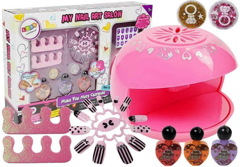 Csillámos körömlakk szárító készlet Megoldás minden anyukának, akinek a lánya kozmetikumokat vásárol, és mindenekelőtt szereti a körömlakkokat - saját manikűrkészlet. Ez változatossá teszi a játékokat, lehetővé teszi, hogy kozmetikus vagy műkörmös legyen. Talán ez a szakma felkelti az érdeklődését? A két karakter biztosan fejleszti gyermeke kreativitását és fantáziáját. Hogyan kell használni ezeket a lakkokat és egyéb kütyüket? Miután rúzs alakú reszelővel kiegyenlítette a körmök hosszát és formáját, vigye fel a kiválasztott színt a körmökre. A következő lépés az lehet, hogy a nyélt egy speciális körömszárítóba helyezi. Egy ilyen kész manikűr fenomenális és eredeti lesz! Lakkkal festheti a körmeit, és az eredeti és változatos mintázatú matricáknak köszönhetően. A készletnek köszönhetően szépsége biztonságosan és korának megfelelően gondoskodhat körmei gyönyörű megjelenéséről. A készletben található körömlakkok egészséges, ártalmatlan és nem mérgező anyagokból készülnek, így nem károsítják a lányok körmeit. A készlet tartalma: - körömszárító - 3 színű lakkbőr cipő: narancssárga, lila és rózsaszín - matricák - 2 ujjas elválasztó - rózsaszín - stift a matricák felhelyezéséhez - csillámpor és jets - műköröm sablon   Szárító méretei: 9 cm x 9 cm x 6,5 cm A csomag mérete:  38 cm x 25,5 cm x 7,5 cm  A szárító 2 db 1,5 V-os AA elemmel működik. 5 év feletti gyermekek számára. EN71 szabványnak megfelelő játék.