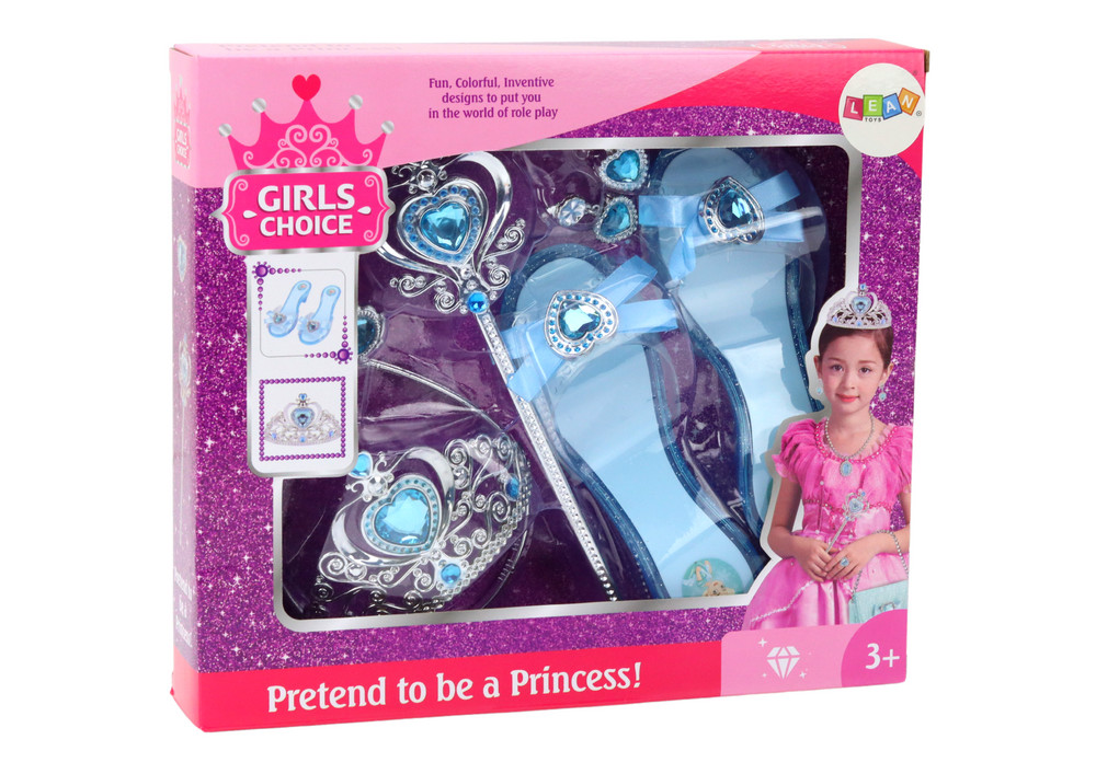 Kiegészítőkészlet egy kis hercegnő korona papucshoz, kék színben. Egy kis hercegnő kiegészítőkészlete nem csupán egy átlagos játék - ez egy varázslatos kulcs, amely megnyitja az ajtót egy fantasztikus világba, ahol az álmok valóra válnak. A fényes kövekkel díszített korona minden kis hölgy érzékeit beragyogja, egyedi bájt és eleganciát kölcsönözve neki, amely méltó a királyi udvarhoz. A bájos kék masnival és csillogó gyémántokkal díszített magas sarkú papucsok minden lépést izgalmassá tesznek. Pálca, korona, gyűrű és fülbevalók - ezek olyan kiegészítők, amelyek serkentik a képzeletet és rendkívüli történetek megalkotására inspirálnak. A gyerekek királynők és hercegnők szerepét játszhatják, felfedezhetik képzeletük varázsát és fantasztikus történeteket alkothatnak az udvari életről. Átlépve ezt a rendkívüli készletet, a gyerekek egy varázslattal, kreativitással és felejthetetlen pillanatokkal teli világba lépnek be. A csomag mérete: 31,5cm x 28cm x 5,5cm. CE tanúsítvánnyal rendelkezik és megfelel az EN71 szabványnak. 3 év feletti gyermekek számára készült.