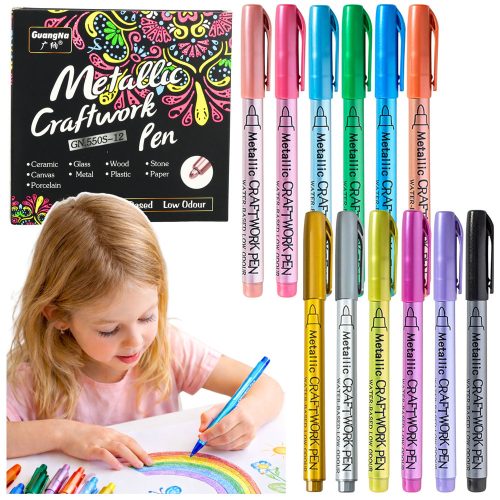 12 DARABOS NEJLON HEGYŰ METÁL TOLLAKKÉSZLETEz a 12 darabos fémes tollkészlet tökéletes eszköz szemet gyönyörködtető dekorációk, rajzok és művészi projektek készítéséhez. Az intenzív, csillogó színek egyedi karaktert kölcsönöznek munkáidnak, így tökéletesek scrapbookinghoz, kalligráfiához, üdvözlőlapok, kövek, üveg, kerámia és egyéb felületek díszítéséhez.A tollak puha és rugalmas nejlon hegyűek, amelyek biztosítják a sima vonalakat és a kényelmes használatot. A precíz hegy lehetővé teszi mind a finom részletek rajzolását, mind a nagyobb felületek kitöltését.A vízbázisú tinta szagtalan és gyorsan szárad, így könnyen használható. A fémes hatás különösen sötét felületeken látható, így projektjeid elegáns és fényes megjelenést kölcsönöznek.A termék CE-minősítéssel rendelkezik, amely igazolja az Európai Unióban alkalmazandó európai biztonsági szabványoknak és minőségi követelményeknek való megfelelést.SPECIFIKÁCIÓK:Terméktípus: Fémes filctollakMennyiség a készletben: 12Hegy: Nejlon, puha és rugalmasTintatípus: VízbázisúAlkalmazás: Papír, karton, üveg, kerámia, kő, műanyagCsomag méretei: 15 x 14,5 cmA KÉSZLET TARTALMA:12 fémes filctollCsomag