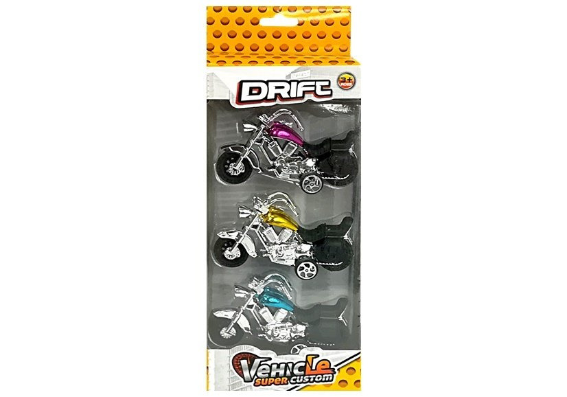 3 darabos motorkerékpár mozgásban készlet A kis járművek a legnépszerűbb játékok, amelyeket minden korosztályú fiú imád. Elsősorban szórakozásra és gyűjtésre használják őket. Motorkerékpárjaink tartós anyagból készültek. A motorkerékpár nagy előnye a projektekhez való teljesítménye, aminek köszönhetően minden fiú tekintetét vonzza. Modelljeink mozgásban vannak. Elég hátrahúzni a játékot a földön, és máris elindulhat. A készlet a következő színekben található motorkerékpárokat tartalmazza: - rózsaszín - arany - kék Motorkerékpár méretei: 9 cm x 5 cm x 3 cm Méretek: 26 cm x 10 cm x 4,5 cm A motorkerékpárok 3 év feletti gyermekek számára készültek. CE tanúsítvánnyal rendelkeznek, és megfelelnek az EN 71 szabványnak. A készlet átlátszó ablakkal ellátott csomagolásban található, amely ajándékot jelenthet egy gyermek számára.