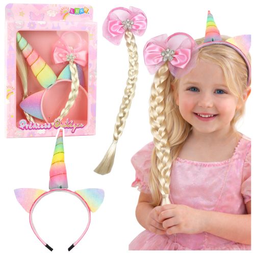 EGYSZARVÚ FEJPÁNT ÉS RUGALMAS FONAT KÉSZLET GYEREKEKNEKEz a mesebeli, unikornis motívumos készlet egyedi kiegészítő azoknak a gyerekeknek, akik imádják a színes hajdíszeket, a beöltözést és a varázslatos frizurákat. A készlet tartalmaz egy színes unikornis fülekkel és szarvval ellátott fejpántot, valamint egy hosszú fonattal ellátott hajpántot, amely lehetővé teszi a gyerekek számára, hogy egységes és feltűnő, a fantázia világa ihlette frizurákat alkossanak. A teljes készletet az esztétika, a kényelem és a biztonság szem előtt tartásával tervezték a legfiatalabb felhasználók számára. A fejpánt univerzális méretű, könnyen illeszkedik bármilyen gyermek fejére, és kényelmes viselet, akár hosszabb ideig is. A színes unikornis fülek és szarv mesebeli karaktert kölcsönöznek neki, és vonzzák a figyelmet. A hajpántot egy nagy rózsaszín masni díszíti, amely gyönyörűen kiegészíti a könnyű fonatot, elegáns és lányos akcentust teremtve. A hosszú fonat lehetővé teszi, hogy gyermeked mesefigurának érezze magát, és változatosságot visz bármilyen játékidőbe. Ez a készlet tökéletes mindennapi játékhoz, születésnapokhoz, jelmezbálokhoz, fotózásokhoz, vagy jelmez részeként különleges alkalmakra. A kiegészítőkkel való játék fejleszti a képzeletet és a kreativitást, és lehetővé teszi gyermeked számára, hogy megjelenésén keresztül kifejezze magát. Ez a termék ajándékötletként is remek. SPECIFIKÁCIÓK:Terméktípus: Hajkiegészítő készletTéma: UnikornisFunkció: Hajformázás és öltöztetésAnyag: Műanyag és szintetikus szálakKészlet tartalma: Fejpánt és hajgumi fonattalFejpánt: Színes unikornis fülek és szarvGumiszalag: Nagy rózsaszín masniFejpánt illeszkedése: UniverzálisCsomag méretei: 29,5 x 20,5 x 3 cmKÉSZLET TARTALMA:Fejpánt unikornis fülekkel és szarvvalHajgumi fonattal és rózsaszín masnival