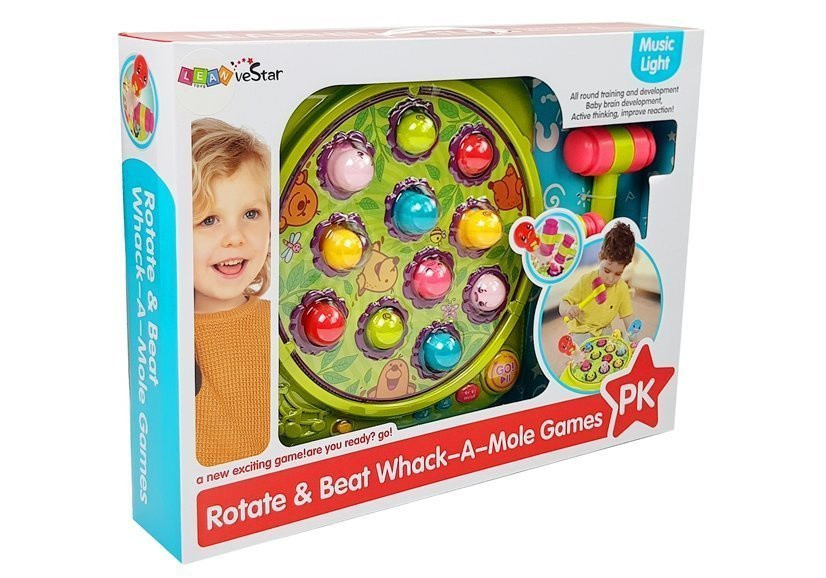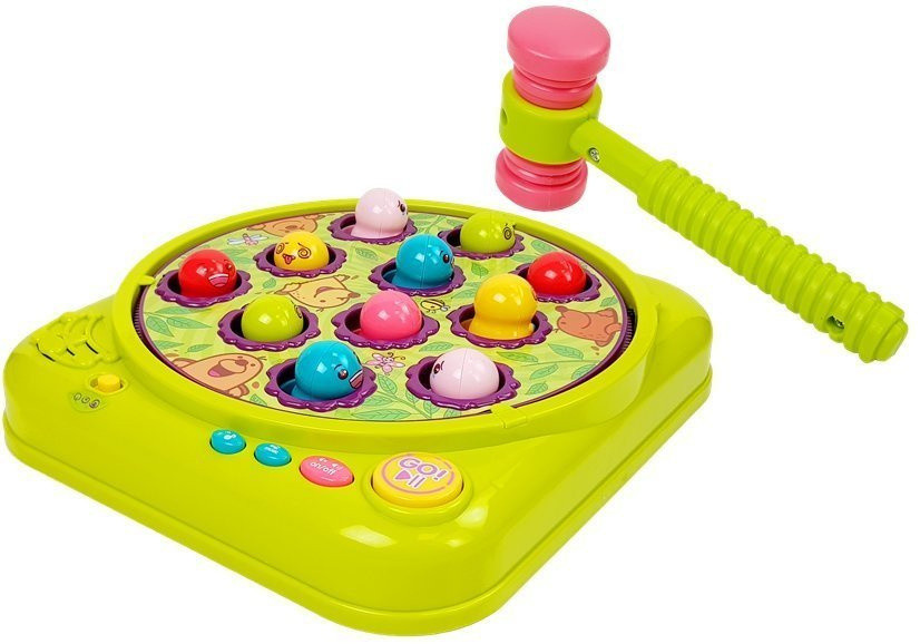 Ügyességi játék Vakondütés Hangütés játék - vakond! Ez egy nagyszerű ügyességi játék, amely fejleszti a reflexeket és az érzékelést. A játék nem könnyű, de minden gyermek örömét leli benne! A kézügyesség, valamint a hallás és a látás intenzíven fejlődik a játék során. Indíts el egy otthoni versenyt, meglátjuk, ki nyer. Játékszabályok: 11 hörcsög van a pajzson. A GO gomb megnyomása után a tábla forog. A tempót a csúszkával állíthatod be, gyorsabb - lassabb. A hörcsögök kijönnek a lyukból és elbújnak. A feladatod, hogy gumikalapáccsal fejbe üsd őket. Egy jó ütésnek számít, ha a hörcsög kiugrik a lyukból a táblán kívül. Amikor a forgótányér forgása leáll, lejár az idő. Számold meg az ütések számát, és add át a kalapácsot a másik személynek. Az eltalált hörcsögök száma határozza meg a győzelmet! Minél gyorsabb a sebesség, annál nehezebb. A mókát vidám zene kíséri. A készlet elemei: - hörcsögös játéktábla - két különböző méretű gumikalapács Méretek: - hörcsögös pajzs: 27 cm x 26 cm x 7 cm - kisebb kalapács: 13,5 m x 6 cm x 3 cm - nagyobb kalapács: 24 cm x 8 cm x 4 cm A csomag mérete: 46 cm x 34 cm x 9 cm 3 év feletti gyermekek számára készült. A játék négy 1,5 V-os elemmel működik. Megfelel az EN71 és a CE tanúsítványnak.