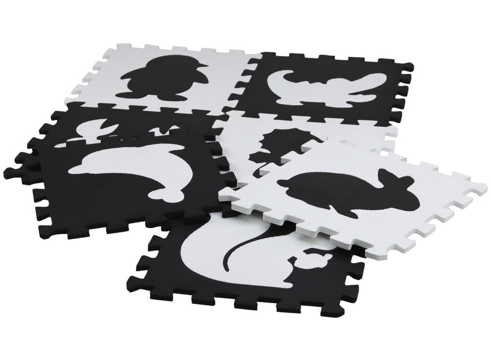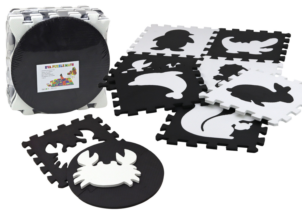 Puha kirakós szőnyeg Kontrasztos Oktató EVA habszivacsból, fekete-fehér, 19 darabos.