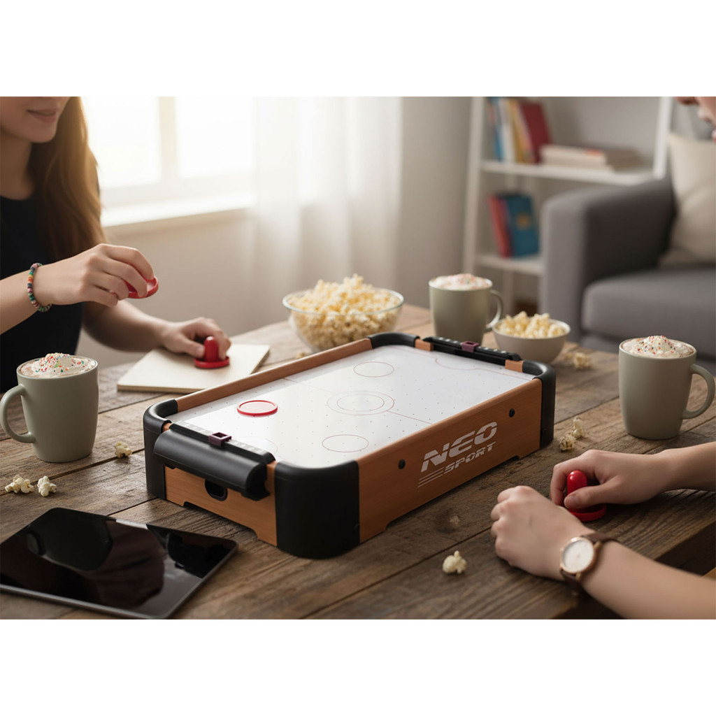 Mini Air Hockey - Neosport!Főbb jellemzők:Energiatakarékos,2 korong,2 játéktartó játékosonként,analóg számláló,légáramlási rendszer,6 db AA 1,5 V-os elemmel működik,könnyű összeszerelés,masszív konstrukció,könnyű és stabil szerkezet.Gondosan kidolgozott részletekAir Hockey Air Hockey asztalAz Air Hockey hordozható változata tökéletes ajándék a versenysportokat kedvelő gyerekeknek.A gyors, dinamikus játékmenet fejleszti gyermeke reflexeit és koncentrációját, és az egyes gólok okozta elégedettség minden egyes mérkőzéssel növekszik.Az Air Hockey mindenkit leköthet – ezzel a játékkal a szobádban soha nem fogsz unatkozni!Az asztali hoki órákig leköt!Specifikációk:Könnyű összeszerelés,Termék súlya: 1,1 kg,Méretek: 38 x 21,5 x 7 cm.
