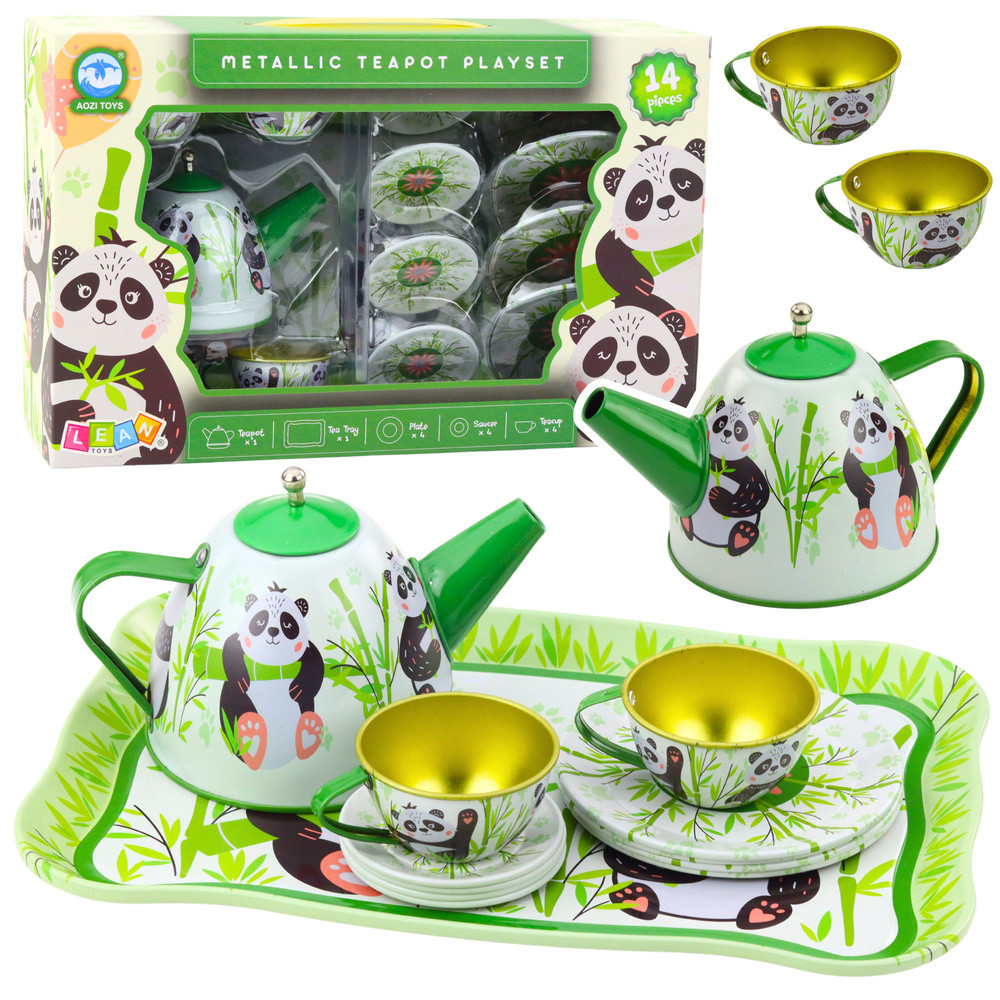 Teáskészlet Fém kancsó csésze tányérok Panda Green 14 db