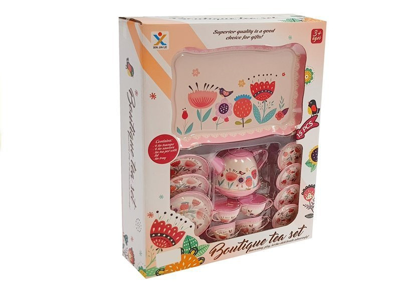 Teáskészlet Csészék Teáskanna 14 elemes Nagyméretű készletünk lehetővé teszi a lányok számára a hosszan tartó és remek szórakozást. Az oktatójátékok befolyásolják a gyermekek képzelőerejének, tapintásérzékének és önálló gondolkodásának fejlődését, miközben nagyszerű szórakozást biztosítanak. Minden lány már kiskorától fogva szeret felnőttek szerepét eljátszani. Hagyd, hogy gyermeked meghívja barátait egy délutáni teázásra. A készlet gyönyörű fehér és rózsaszín színekben készült, virágmotívummal. A készlet tartalma: - 4 csésze - 4 csészealátét - 4 tányér - vízforraló - tálca A készlet elemeinek méretei: -   csésze: átmérő - 5 cm, magasság - 3 cm -   csészealátét: átmérő - 6 cm -   tányér: átmérő - 9 cm -   vízforraló: magasság - 8,5 cm, alap átmérője - 8,5 cm -   tálca: 23,5 cm x 15,5 cm Doboz méretei: 39 cm x 31 cm x 10 cm A teáskészlet 3 év feletti gyermekek számára készült. A játékok CE minősítéssel rendelkeznek és megfelelnek az EN 71 szabványnak. A készlet egy színes, átlátszó üvegtokkal ellátott dobozba van csomagolva, így ajándéknak is alkalmasak gyermekek számára.