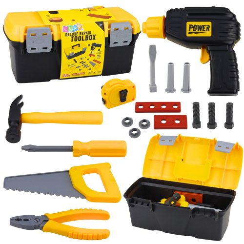 GYERMEK SZERSZÁMLÁZ - ELEMES CSAVARHÚZÓ, 23 DARABOSEz a barkács szerszámosláda tökéletes készlet azoknak a gyerekeknek, akik szeretnek felnőtteket utánozni otthoni javítások és műszaki feladatok során. A valósághű szerszámok, a funkcionális szerszámosláda és az elemes csavarhúzó hihetetlenül lebilincselővé és lebilincselővé teszik a játékot. Nagyszerű módja a kreativitás és a kézügyesség fejlesztésének már fiatal kortól.A készlet 23 darabot tartalmaz, lehetővé téve, hogy gyermeked igazi profivá váljon. A készlet tartalmaz egy elemes csavarhúzót, kalapácsot, fűrészt, csavarhúzót, fogót, csavarokat és további tartozékokat. A mozgatható alkatrészek és az alkatrészek be- és kicsavarásának lehetősége segít a finommotoros készségek, a kéz-szem koordináció és a logikus gondolkodás fejlesztésében.A masszív doboz kényelmes fogantyúval lehetővé teszi, hogy az összes darabot egy helyen tárold. Ez segít gyermekednek megtanulni rendszerezni és rendszerezni a játékterét. Kompakt méretének köszönhetően a készlet könnyen magával vihető kirándulásokra vagy nagyszülők látogatására. Nagyszerű ajándékötlet egy olyan gyermek számára, akit érdekelnek a szerszámok és élvezi a kreatív szerepjátékokat. SPECIFIKÁCIÓK: Doboz méretei: 31,5 x 16 x 14 cm Darabszám: 23 darab Csavarhúzó: Elemes, valósághű megjelenés Tápellátás: 2 x 1,5 V-os AA elem (nem tartozék) Anyag: Kiváló minőségű műanyag Funkciók: Alkatrészek csavarozása és kioldása, szerepjáték A KÉSZLET TARTALMA: Szerszámosláda Elemes csavarhúzó Csavarhúzó bitek Kalapács Fűrész Csavarhúzó Fogó Mérés Csavarok és szerelési tartozékok