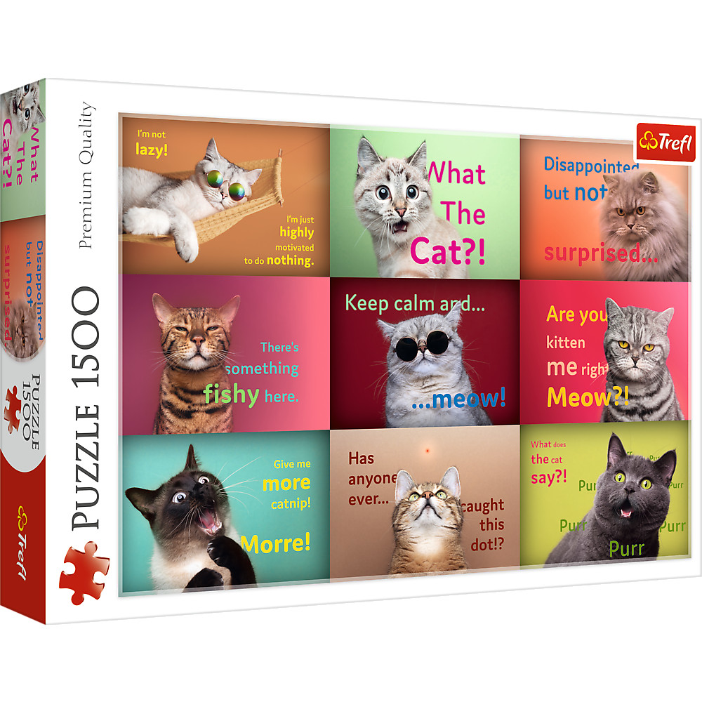 Trefl 26212 Vicces macskaportrék 1500 darabos kirakó A Vicces macskaportrék kirakó 1500 darabból áll, és vicces macskás mémeket tartalmaz. Összerakva a kirakó egy 850 x 580 mm-es képet alkot. A termék kiváló minőségű anyagokból készült, speciális kalanderezett, fényvisszaverő papírral a könnyű összeszerelés érdekében. Lengyelországban gyártják, környezetbarát gondossággal.