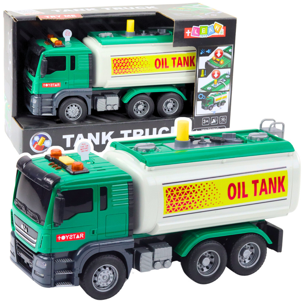 TEHERAUTÓ TARTÁLY VÍZFÉNYEK ZÖLD HANGOK A tartálykocsi egy olyan jármű, amely fontos szerepet játszik az üzemanyagok és folyékony anyagok szállításában. Most gyermeked igazi sofőrnek érezheti magát egy ilyen gép segítségével, amely a valósághű megjelenést interaktív funkciókkal ötvözi. A teherautó vízöntő funkcióval, fényeffektusokkal és valósághű hangokkal van felszerelve, amelyeket a tetőn található gombokkal lehet aktiválni. A csatlakoztatott flexibilis tömlő lehetővé teszi a valódi tankolást - a tartály feltöltése után csak nyomja meg a pumpát, és a víz elkezd folyni a csúcson. Ez egy rendkívül lebilincselő játékelem, amely serkenti a képzeletet, és lehetővé teszi a gyermek számára, hogy a speciális járművek vezetőinek mindennapi életéből vett jeleneteket játsszon el. A fényjelzők, valamint a tolatás, a kürt és a járműindítás hangjai realizmust kölcsönöznek, és minden játékot izgalmas akcióvá varázsolnak. A játék kiváló minőségű, biztonságos és tartós anyagokból készült. Nagyszerű ajándékötlet - esztétikus dobozban csomagolva, a dobozból kivéve azonnal használatra kész. SPECIFIKÁCIÓ: Teherautó méretei: 26 x 12 x 10 cm Csomagolás méretei: 30,5 x 18 x 12,5 cm Tápegység: 3 x AG13 (tartozék) Anyag: műanyag Effektek: hang (kürt, tolatás, motor), fény (kakasok) Speciális funkció: víz kiöntése a mellékelt tömlőn keresztül Alkalmazás: tematikus szórakozás, kreativitás és kézügyesség fejlesztése A KÉSZLET TARTALMA: Tartálykocsi vízfunkcióval Rugalmas tömlő víz kiöntéséhez 3 AG13 elem Esztétikus csomagolás