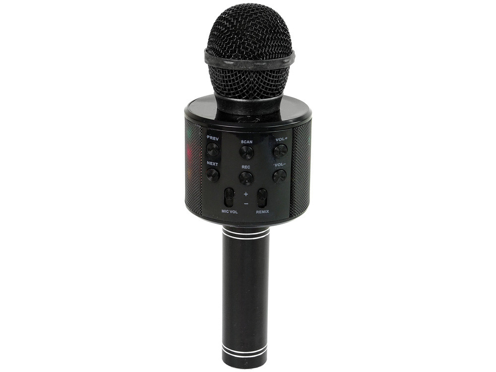Vezeték nélküli mikrofon USB hangszóró karaoke felvevő WS-858 fekete  Ideje egy kis szuper mókának karaokézni! Éneklés, tánc, szórakozás! A zene jelenléte rendkívül pozitív hatással van minden gyermek megfelelő fejlődésére. A hallás és a ritmusérzék a játék révén fejlődik. Egy ilyen játék tökéletes ajándék minden kis művésznek, aki szeret énekelni és fellépni az otthoni színpadon. A karaoke mikrofon nagyon könnyen használható - csak csatlakoztasd Bluetooth-on keresztül egy külső eszközhöz - mobiltelefonhoz vagy laptophoz, és játssz le háttérzenét. A beépített két hangszóró szuper hangrendszert biztosít. Ha egy másik eszközhöz csatlakoztatod, zenét játszik le, és egyidejűleg rávetíti a hangunkat! Mostantól a mikrofon mindig Önnél lehet, és nem korlátozza a szórakozást! A tökéletes bulieszköz minden korosztály számára! Mikrofon funkciók: - vezeték nélküli - iPadhez, iPhone-hoz, tablethez vagy akár CD-lejátszóhoz is csatlakoztatható - a legtöbb Bluetooth-eszközzel kompatibilis - két hangszóró - villogó színes LED-ek - 5 V-os tápegység - AUX aljzat  Milyen gombok felelősek a panelen? - REC - hangfelvétel és hangmoduláció - PREV - egy dal előreugrása - NEXT - dal visszatekerése - MIC VOL - ének hangereje - SCAN - szünet és szelfi pillanatkép - VOL+ és VOL - hangerőszabályzó -REMIX - hangok keverése   Specifikációk: - anyag: alumínium, műanyag - frekvenciatartomány: 100Hz - 10kHz - újratölthető akkumulátor: 800 mAh - töltési idő: 3-4 óra - üzemidő: kb. 5 óra - teljesítmény - 5W   Mikrofon méretei: 23 cm x 8 cm x 8 cm Doboz méretei: 25 cm x 9 cm x 8 cm Tökéletes ajándék egy kis zenei sztárnak. A játék beépített 18650-es akkumulátorral rendelkezik, amely USB-kábelen keresztül tölthető. 3 év feletti gyermekek számára alkalmas.