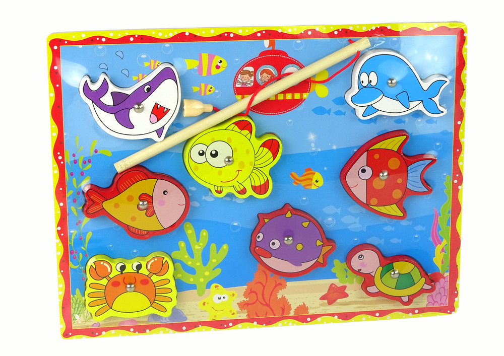 Fa horgászkészlet színes mágnessel   Ez a játék egy fából készült oktatókészlet, amely arra ösztönzi a gyerekeket, hogy felfedezzék a tengeri világot. A készlet fő eleme egy színes tábla, amely egy gyönyörű tengerfenéket ábrázol. A tábla tömör fából készült, és színes rajzokkal díszített, amelyek a tengeri élővilág sokszínűségét tükrözik. A készlet számos fa tengeri állatfigurát tartalmaz, amelyeket a gyerekek elhelyezhetnek a táblán. Ezek a figurák a következőket tartalmazzák: Négy imádnivaló fa hal, mindegyik más színre festve, hogy segítsék a gyerekeket a színek felismerésében és megnevezésében. Egy cápa, amely különösen lenyűgöző és lenyűgöző a gyerekek számára. Egy tengeri teknős, a hosszú élet és a béke szimbóluma. Egy rák, amely egyedi megjelenéséről és mozgásáról ismert. Egy kis delfin, amely bájt kölcsönöz a készletnek, és barátságos kalauzként tekinthető a tengeri világban. Ami ezeket a figurákat kiemeli, az a mágnesek jelenléte az elöl. Ezeknek a mágneseknek köszönhetően a gyerekek a mellékelt fa horgászbottal és a mágnessel kifoghatják ezeket az aranyos lényeket. Ez egy olyan játék, amely fejleszti a motoros készségeket, a motoros koordinációt és a koncentrációt. A játék nemcsak szórakoztató, hanem oktató jellegű is, mivel segít a gyerekeknek fejleszteni a képzeletüket és a tengeri világ megértését. Ezenkívül a fával való érintkezés hozzájárul a játék természetességéhez, és ösztönözheti a gyerekeket a környezetvédelemre. A teljes készlet tartós fából készült, ami garantálja a hosszan tartó szórakozást. Tökéletes ajándék a kis felfedezőknek, akik szeretik a tengereket és az óceánokat, valamint az általuk rejtőző lenyűgöző világot.   A készlet tartalma: - 8 tengeri állat - horgászbot   A készlet méretei: 30cm x 22cm x 1cm   CE tanúsítvánnyal rendelkezik és megfelel az EN71 szabványnak. A játék 3 év feletti gyermekek számára készült.