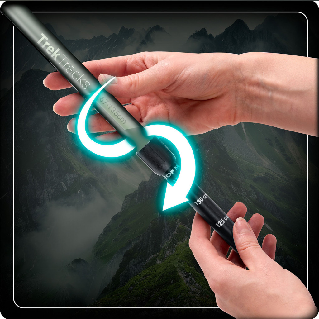 ◾ 65 cm-től 135 cm-ig terjedő tartomány - a rudak teleszkóposak, ami lehetővé teszi a hossz egyszerű beállítását, valamint a felhasználó magasságához és a tereptípushoz való alkalmazkodást.