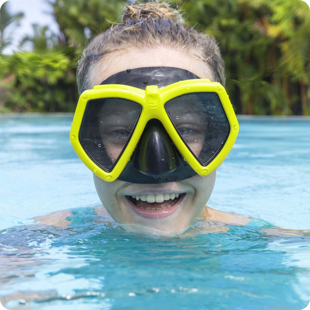 BÚVÁRMASZK BESTWAY 22040-01 Bestway búvármaszk. Most már kedvedre merülhetsz és élvezheted a vízi szórakozást! Az úszómaszk polikarbonát lencsékkel rendelkezik Széles látószöget biztosít, így nem marad le a víz alatti világ egyetlen eleméről sem! Ezenkívül tökéletesen alkalmazkodik az arc formájához, megakadályozva a víz szivárgását. Az állítható pánt segít a maszk a helyén tartásában. Főbb jellemzők: egy méret mindenkinek alkalmazkodik az archoz latex mentes Műszaki adatok: Szilikon szíj Polikarbonát lencse UV-védő bevonattal Súlya 0,16 kg