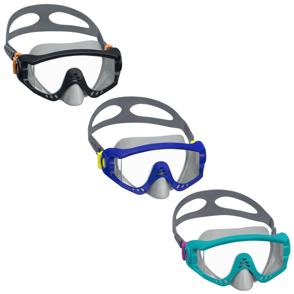 BÚVÁRMASZK BESTWAY 22044-03 Bestway búvármaszk. Most már annyit merülhet és szórakozhat a vízben, amennyit csak akar! Az úszómaszk polikarbonát lencsékkel rendelkezik. Széles látószöget biztosít, így nem marad le a víz alatti világ egyetlen eleméről sem! Ezenkívül tökéletesen alkalmazkodik az arc formájához, megakadályozva a vízszivárgást. Az állítható pánt segít a helyén tartani a maszkot. Főbb jellemzők: univerzális méret alkalmazkodik az archoz latex mentes Műszaki adatok: Szilikon szíj Polikarbonát lencse UV-védő bevonattal Javasolt életkor: 14+ Súlya 0,26 kg