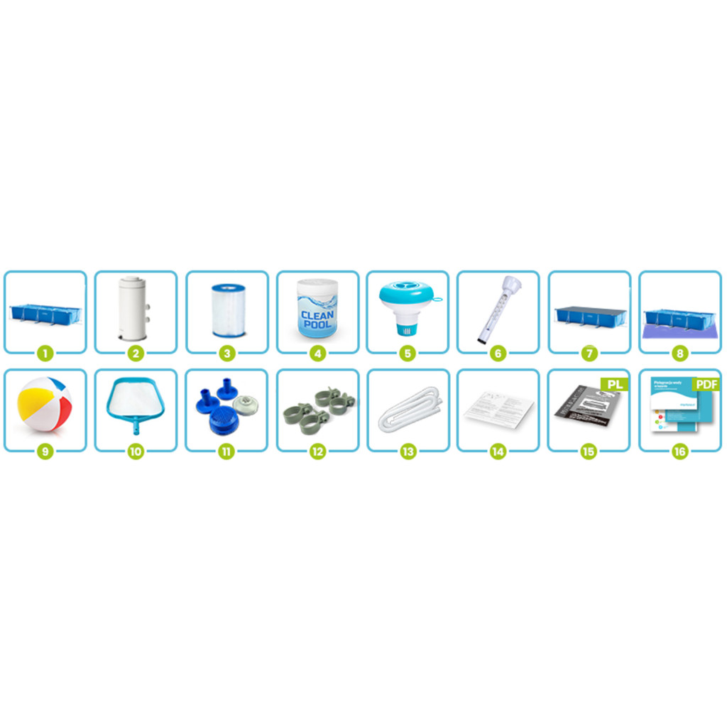 Négyszögletű vázas medence 450 x 220 x 84 cm INTEX 28274 Készülj a forró nyárra? Élvezze a meleg időt saját kertje kényelmében. A medence könnyen összeszerelhető. Néhány pillanat alatt elkészítheti saját kezűleg, szerszám nélkül. A bemutatott INTEX uszoda megvásárlásával biztos lehet benne, hogy a termék új, eredeti és biztonságos A készlet tartalma: Keretes medence 450 x 220 x 84 cm Szűrőszivattyú Szivattyúszűrő Multitabletta 25x20g Vegyszer adagoló Medence hőmérő Medence burkolat Medence szőnyeg Strandlabda Háló a szennyeződések felfogására Szivattyúszűrők Szivattyú bilincsek Szivattyútömlők Javítsa ki a javítást Lengyel nyelvű utasítások Útmutató – letölthető az aukción VÁSÁROLJON EGY JOGOSULT KERESKEDELŐTŐL Nyersz: garanciális és jótállás utáni szerviz, hozzáférés a tartozékok legszélesebb választékához, szakképzett személyzet segítsége, információk és bizonyított használati tanácsok, mindig új és kiváló minőségű termékek 15 év tapasztalat a piacon! ? Több mint 2 millió ügyfelet szolgáltak ki? ez azt jelenti, hogy statisztikailag legalább egy szomszédja vett tőlünk kerti medencét vagy medencetartozékokat. A legmagasabb minőségi kidolgozás Tartós 3 rétegű PVC anyag Nylon hálós megerősítés a rétegek között Szúrásálló bevonat A belső tér fehér és kék mozaikot imitál A medence 3 gyors lépésben készen áll: Bontsa ki a héjat, Szerelje össze a keretet - szerszám nélkül Öntsön vizet – kész! Most egy ilyen nagy medence kibontása eltart néhány pillanatig Műszaki adatok: Úszómedence A medence méretei 450 x 220 x 84 cm Medence súlya 42,3 kg Javasolt vízfeltöltés 90% Űrtartalma 7127 liter Szivattyú A szivattyú teljesítménye 2006 liter/óra Szivattyú tápellátása 220 - 240 V Legyen ez a nyár tele csodálatos élményekkel! ?