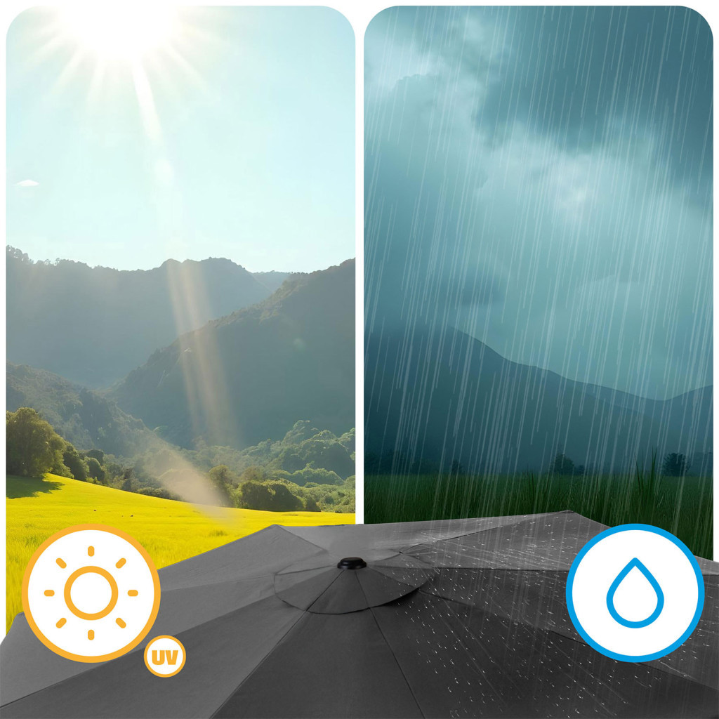 Termékleírás Plonos kerti esernyő 300 cm Plonus: 488400 Borító színe: grafit Azoknak, akik szeretik a szabadban tölteni az időt – a teraszon, erkélyen, a kertben vagy a strandon. Vízálló – sűrű szövésű, 160 g/m² poliészter hatékonyan véd az esőtől. Nagy árnyékoló – akár 3 m átmérőjű, szellőzőnyílás a levegő keringéséhez. Masszív és stabil – 6 szegmenses ernyő, acélváz és bordák a maximális tartósság érdekében. Praktikus – a dőlésszög és magasság gyors állítása, egyszerű összecsukás. INGYENES BURKOLAT – a kényelmes tárolás és védelem érdekében! Könnyű és sima összecsukhatóság és beállítás! Az intuitív összecsukható mechanizmusnak köszönhetően néhány másodperc alatt kinyithatja és becsukhatja az esernyőt – felesleges erőfeszítés nélkül. A gomb és a hajlítható kar lehetővé teszi a dőlésszög zökkenőmentes beállítását , lehetővé téve a burkolat beállítását az aktuális időjárási viszonyokhoz. Kifinomult részletek – kiváló minőségű kivitelezés! Egyszerű és gyors pozícióbeállítás Lehetőség az esernyő szögének bármilyen beállítására. Összecsukva kis helyet foglal. Esernyőhuzat - védelem a fakulás ellen! A strapabíró Oxford anyagból készült huzat tökéletesen védi az esernyőt az UV-sugarak és egyéb légköri tényezők káros hatásaival szemben, megakadályozza az anyag kifakulását és meghosszabbítja élettartamát. Tartós anyag. Welt. Zár. Pajzsod az időjárás szeszélyei ellen! Eső? Nincs esély! A vízálló PE anyagnak köszönhetően esernyőnk hatékonyan véd minden csepp ellen. Nap? Lazíts! A forró napokon kellemes árnyékot ad, a tetején pedig egy okos szellőzőnyílás gondoskodik a szabad légáramlásról. Megbízható védelem minden időjárásban. Műszaki adatok: átmérő : 300 cm, magasság: 240 cm, bejárati magasság: 210 cm, Huzat anyaga: poliészter 160 g/m2, huzat: 160 g/m2 poliészter. *Az alapsúlyokat a készlet nem tartalmazza.