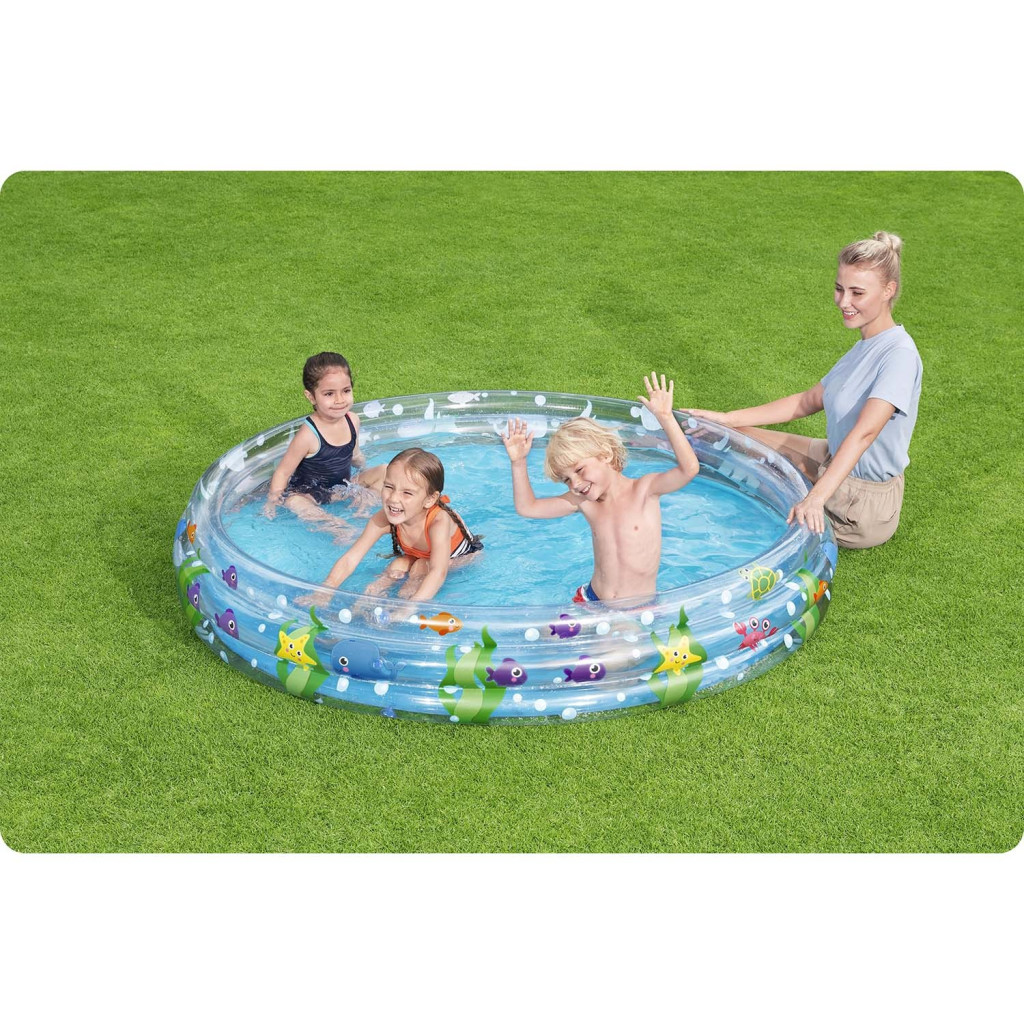 Felfújható medence Hal 152 x 30 cm Bestway 51004 Gyermekeid első medencéje! A Bestway felfújható halmedence tökéletes a kertbe. A medence puha felfújható falai kisgyermekek számára és csodálatos színek. Az átlátszó falak színes halakkal 3 felfújható gyűrűből állnak. Főbb jellemzők: a mélység gyönyörű mintája puha, felfújható falak 3 felfújható gyűrű javítófolt mellékelve Műszaki adatok: Méretei: 183 x 33 cm Anyaga: PVC Súly: 1,80 kg Medence kapacitása: 480 liter Ajánlott életkor: 2 éves kortól