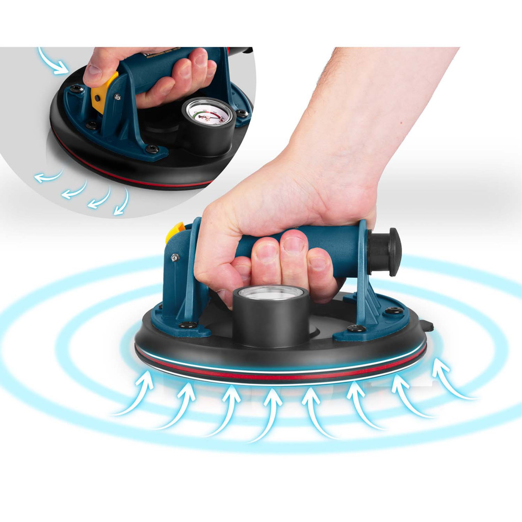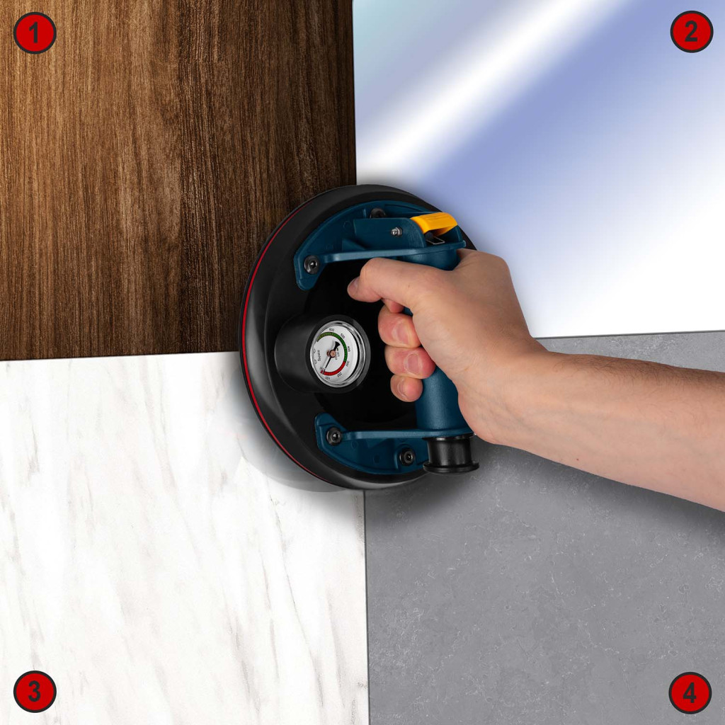 Sima felületre alkalmazva a kézi pumpa kiszívja a levegőt a gumikorong alól, erős vákuumot hozva létre, amely szilárdan "összeragasztja" azt az anyaggal.