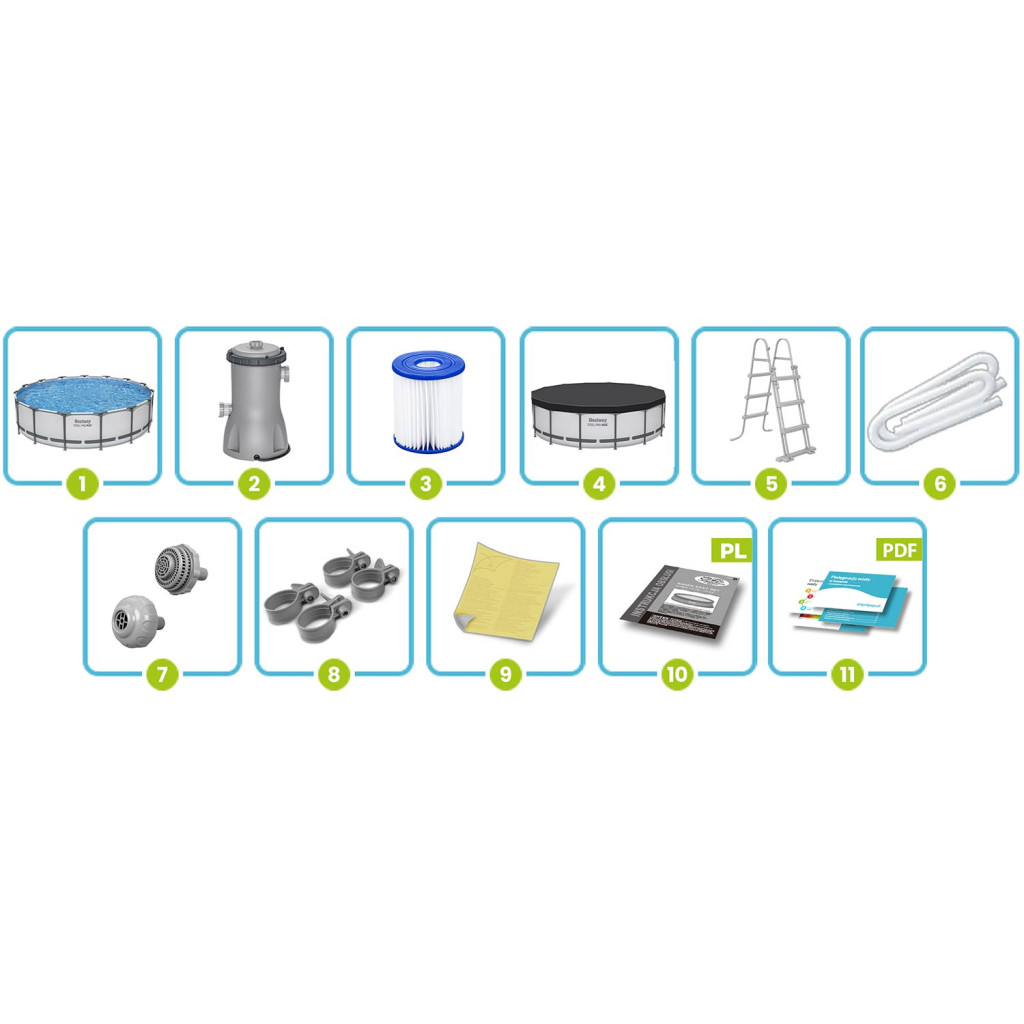 Keretes kerti medence pumpával, 457 x 107 cm Bestway katalógusszám? 56488 HIT fedél és pumpa mellékelve! Ha nagy, megbízható medencére van szüksége, ahol szabadon pihenhet, ez a tökéletes választás az Ön számára! Kész készlet teljes felszereléssel? nem kell minden elemet magának keresnie. Ha külön kiegészítőkkel ellátott Bestway medencét vásárol, biztos lehet benne, hogy a legjobb minőséget kapja, és minden passzolni fog. TARTALOM BEÁLLÍTÁSA Keret medence 457 x 107 cm Szűrőszivattyú II típusú szivattyúszűrő Biztonságos létra Medence burkolat Szivattyúszűrők Szivattyú bilincsek Szivattyútömlők Javítsa ki a javítást Lengyel nyelvű utasítások Útmutató – letölthető az aukción VÁSÁROLJON EGY JOGOSULT KERESKEDELŐTŐL Nyersz: garanciális és jótállás utáni szerviz, hozzáférés a tartozékok legszélesebb választékához, szakosodott személyzet segítsége, a használattal kapcsolatos információk és bizonyított tanácsok, mindig új és kiváló minőségű termékek 15 év tapasztalat a piacon! ? Több mint 2 millió ügyfelet szolgáltak ki? ez azt jelenti, hogy statisztikailag legalább egy szomszédja vett tőlünk kerti medencét vagy medencetartozékokat. Gyermekbiztonság A leszerelhető lépcsők megakadályozzák, hogy felügyelet nélkül hagyott gyerekek lépjenek be A magassága tökéletesen illeszkedik a medence méretéhez Korrózióálló, megerősített fémkeret Csúszásgátló lépcsők Kényelmes kapaszkodók A legmagasabb minőségi kidolgozás Tartós 3 rétegű PVC anyag Nylon hálós megerősítés a rétegek között Szúrásálló bevonat A belső tér fehér és kék mozaikot imitál Borító Érdemes gondoskodni a medence megfelelő védelméről. A medence burkolata tartalmazza: Megvédi a medence vizét a szennyeződésektől Megakadályozza, hogy gyermekek az Ön engedélye nélkül belépjenek a medencébe Lassítja a víz hőveszteségét A medence 3 gyors lépésben készen áll: Bontsa ki a héjat, Összeszerelni a keretet? szerszámok nélkül Öntsön vizet? kész! Most egy ilyen nagy medence kibontása eltart néhány pillanatig MŰSZAKI ADATOK Úszómedence Medence méretei 457 x 107 cm Súlya 57 kg Javasolt vízfeltöltés 90% Űrtartalom 14 970 liter Szivattyú A szivattyú teljesítménye 3028 liter/óra Szivattyú tápellátása 220 - 240 V II-es típusú szivattyúszűrő (58094) Legyen ez a nyár tele csodálatos élményekkel! ?