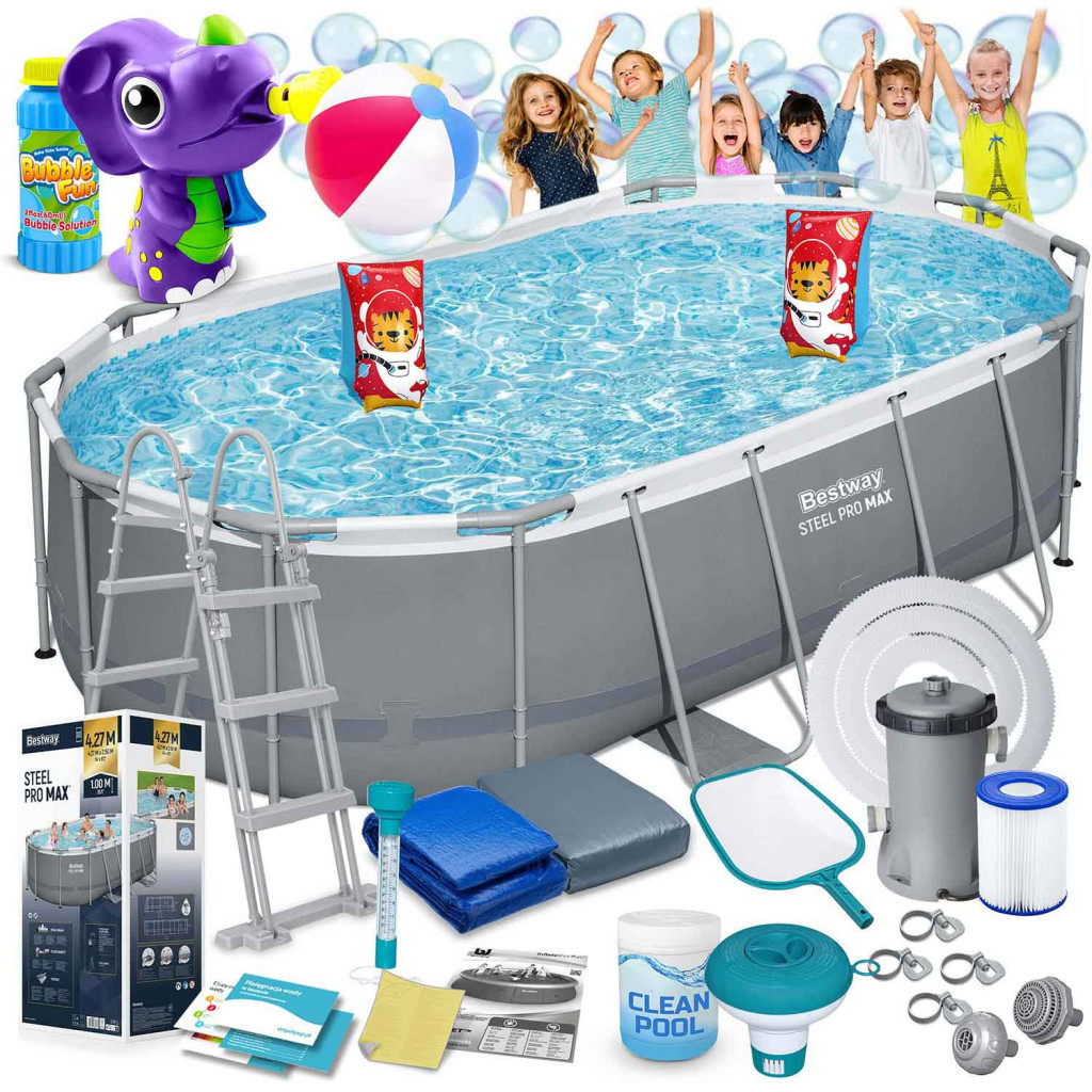 Power Steel keretes kerti medence 427 x 250 x 100 cm Szett 18 az 1-ben BESTWAY ® katalógusszám: 56620 A tökéletes medence kertjébe Ha nagy, megbízható medencére van szüksége, ez a tökéletes választás az Ön számára! Kész készlet teljes felszereléssel – nem kell minden elemet magának keresnie. Ha egy Bestway medencét vásárol speciális kiegészítőkkel, biztos lehet benne, hogy a legjobb minőséget kapja, és minden passzolni fog. INGYENES köpölyözés készlet (játék és folyadék). TARTALOM BEÁLLÍTÁSA Keretes medence 427 x 250 x 100 cm Szűrőszivattyú II típusú szivattyúszűrő Többfunkciós tabletták Vegyszer adagoló Biztonságos létra Medence burkolat Medence szőnyeg Felfújható labda Úszóujj Háló a szennyeződések felfogására Lebegő hőmérő Szivattyúszűrők Szivattyú bilincsek Szivattyútömlők Javítsa ki a javítást Lengyel nyelvű utasítások Útmutató – letölthető az aukción Gyermekbiztonság A leszerelhető lépcsők megakadályozzák, hogy felügyelet nélkül hagyott gyerekek lépjenek be A magassága tökéletesen illeszkedik a medence méretéhez Korrózióálló, megerősített fémkeret Csúszásgátló lépcsők Kényelmes kapaszkodók A legmagasabb minőségi kidolgozás Tartós 3 rétegű PVC anyag Nylon hálós megerősítés a rétegek között Szúrásálló bevonat A belső tér fehér és kék mozaikot imitál Borító Megvédi a medence vizét a szennyeződésektől Megakadályozza, hogy gyermekek az Ön engedélye nélkül belépjenek a medencébe Lassítja a víz hőveszteségét Mat Védi az alját a sérülésektől Védelmet nyújt az ellen, hogy homok és egyéb szennyeződés kerüljön a medencébe Elszigeteli a medencét a talajtól Chemconnect™ flow vegyszer-adagoló A medence vegyszerek alkalmazása még soha nem volt ilyen biztonságos! Az integrált, automata, átfolyó klóradagoló a medencében nem igényel kézi működtetést. Az eszköz a szivattyúval együttműködve egyenletesen oszlatja el a klórt a medencében. MŰSZAKI ADATOK Úszómedence A medence medence méretei 427 x 250 x 100 cm A medence külső méretei: 427 x 290 x 100 cm Űrtartalma 7250 liter Szivattyú A szivattyú teljesítménye 2006 liter/óra Szivattyú tápellátása 220 - 240 V II-es típusú szivattyúszűrő (58094) ️️️ Legyen csodálatos élményekkel ez a nyár! ️️️
