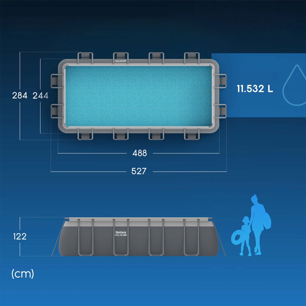 A medence külső méretei 527 x 284 x 122 cm