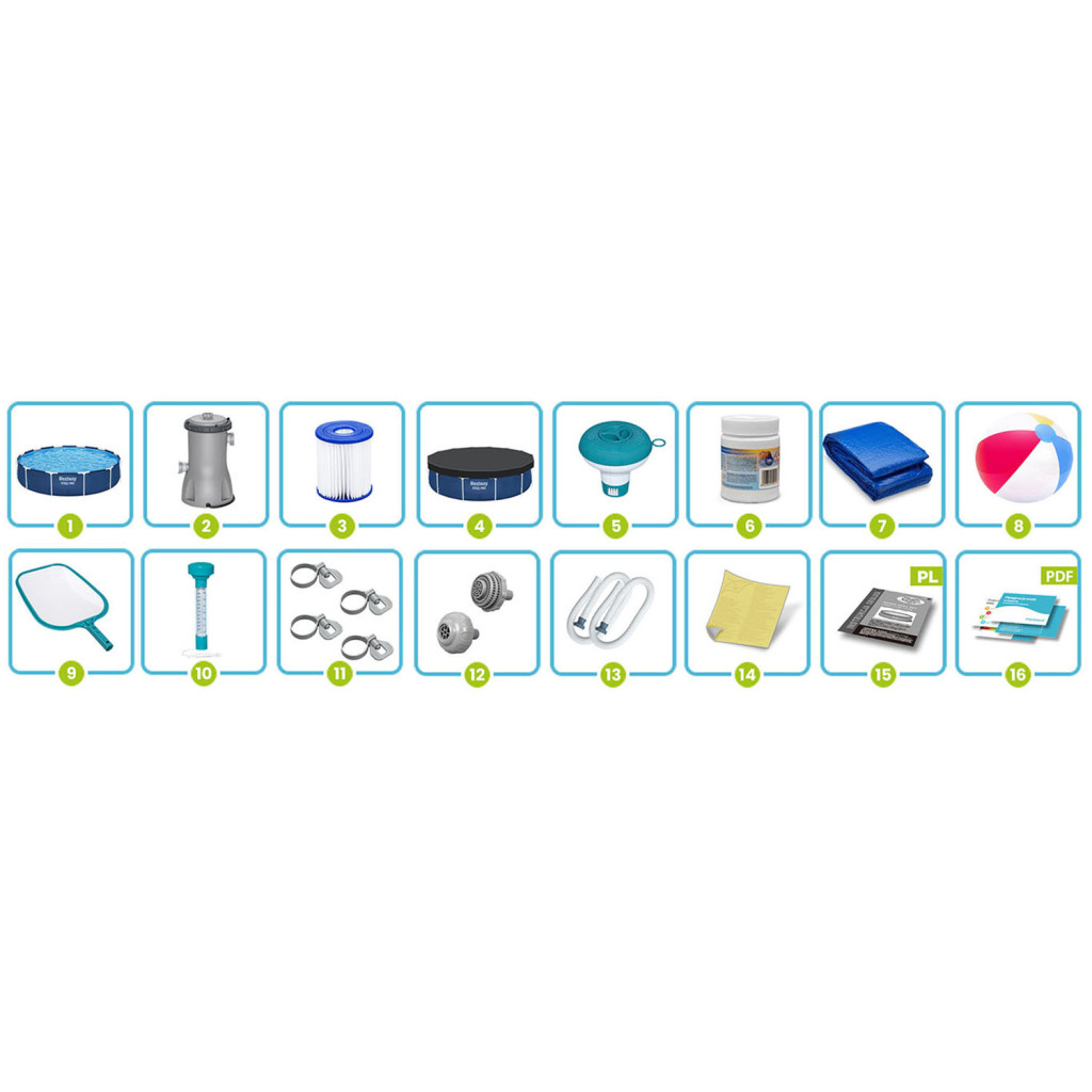 Keretes kerti medence 366 x 76 cm TELJES SZETT 16IN1 Bestway 56681 Élvezze a nyarat a saját medencéjében!!! Ha medencére van szüksége, hogy lehűljön a forró napokon – ez a tökéletes választás az Ön számára! Hívja meg barátait és családját egy medencepartira, és élvezze együtt a nyár örömeit. Ha egy Bestway medencét vásárol speciális kiegészítőkkel, biztos lehet benne, hogy a legjobb minőséget kapja, és minden passzolni fog. A készlet tartalma Keretes medence 366 x 76 cm Szűrőszivattyú Szivattyúszűrő Kémia - Multitabletta 25x20g Vegyszer adagoló Medence hőmérő Medence burkolat Medence szőnyeg Labda Háló a szennyeződések felfogására Szivattyúszűrők Szivattyú bilincsek Szivattyútömlők Javítási folt Lengyel nyelvű utasítások Útmutató – letölthető az aukción A legmagasabb minőségi kidolgozás Tartós 3 rétegű PVC anyag Nylon hálós megerősítés a rétegek között Szúrásálló bevonat Belseje fehér színben Borító Megvédi a medence vizét a szennyeződésektől Megakadályozza, hogy gyermekek az Ön engedélye nélkül belépjenek a medencébe Lassítja a víz hőveszteségét Mat Megvédi az alját a sérülésektől Védelmet nyújt az ellen, hogy homok és egyéb szennyeződés kerüljön a medencébe Elszigeteli a medencét a talajtól Tiszta víz erőfeszítés nélkül A készlet mindent tartalmaz, ami a kristálytiszta vízhez kell: Szűrőszivattyú Hydro Aeration technológiával Továbbfejlesztett patronszűrő 25 több tabletta - átfogó fertőtlenítő Vegyszer adagoló hőmérővel Háló a szennyeződések felfogására A medence 3 gyors lépésben készen áll: Bontsa ki a héjat, Szerelje össze a keretet – nincs szükség szerszámra Felöntjük vízzel és kész! Most egy ilyen nagy medence felállítása csak néhány pillanatot vesz igénybe A medence az egész család számára szórakoztató Élvezze a vízi szórakozást gyermekeivel. Felfújható labda mellékelve Műszaki adatok: Úszómedence: Méretek: 366 x 76 cm Medence súlya: 22,81 kg Javasolt vízfeltöltés 90% Űrtartalma 6473 liter Szivattyú: Szivattyúteljesítmény: 1249 liter/óra Tápfeszültség: 220 - 240 V Szűrő típusa: I. típusú Szivattyúszám: 58381 ️️️ Legyen csodálatos élményekkel ez a nyár! ️️️