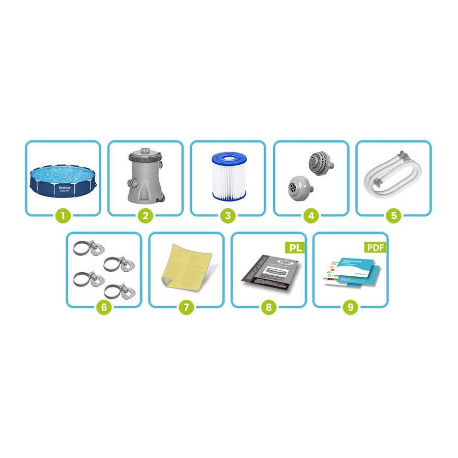 Keretes kerti medence 366 x 76 cm Szett pumpával és szűrővel Bestway 56681 Élvezze a nyarat a saját medencéjében!!! Ha medencére van szüksége, hogy lehűljön a forró napokon – ez a tökéletes választás az Ön számára! Hívja meg barátait és családját egy medencepartira, és élvezze együtt a nyár örömeit. Ha Bestway medencét vásárol, biztos lehet benne, hogy a legjobb minőséget fogja kapni. A készlet tartalma: Keretes medence 366 x 76 cm Szűrőszivattyú I-es típusú szivattyúszűrő Szivattyúszűrők Szivattyú bilincsek Szivattyútömlők Javítási folt Lengyel nyelvű utasítások Útmutató – letölthető az aukción A legmagasabb minőségi kidolgozás Tartós 3 rétegű PVC anyag Nylon hálós megerősítés a rétegek között Szúrásálló bevonat Belseje fehér színben A medence 3 gyors lépésben készen áll: Bontsa ki a héjat, Szerelje össze a keretet – nincs szükség szerszámra Felöntjük vízzel és kész! Most egy ilyen nagy medence felállítása csak néhány pillanatot vesz igénybe Műszaki adatok: Úszómedence: Méretek: 366 x 76 cm Medence súlya: 22,6 kg Javasolt vízfeltöltés 90% Űrtartalma 6473 liter Szivattyú: Szivattyúteljesítmény: 1249 liter/óra Tápfeszültség: 220 - 240 V Szűrő típusa: I. típusú Szivattyúszám: 58381 ️️️ Legyen csodálatos élményekkel ez a nyár! ️️️