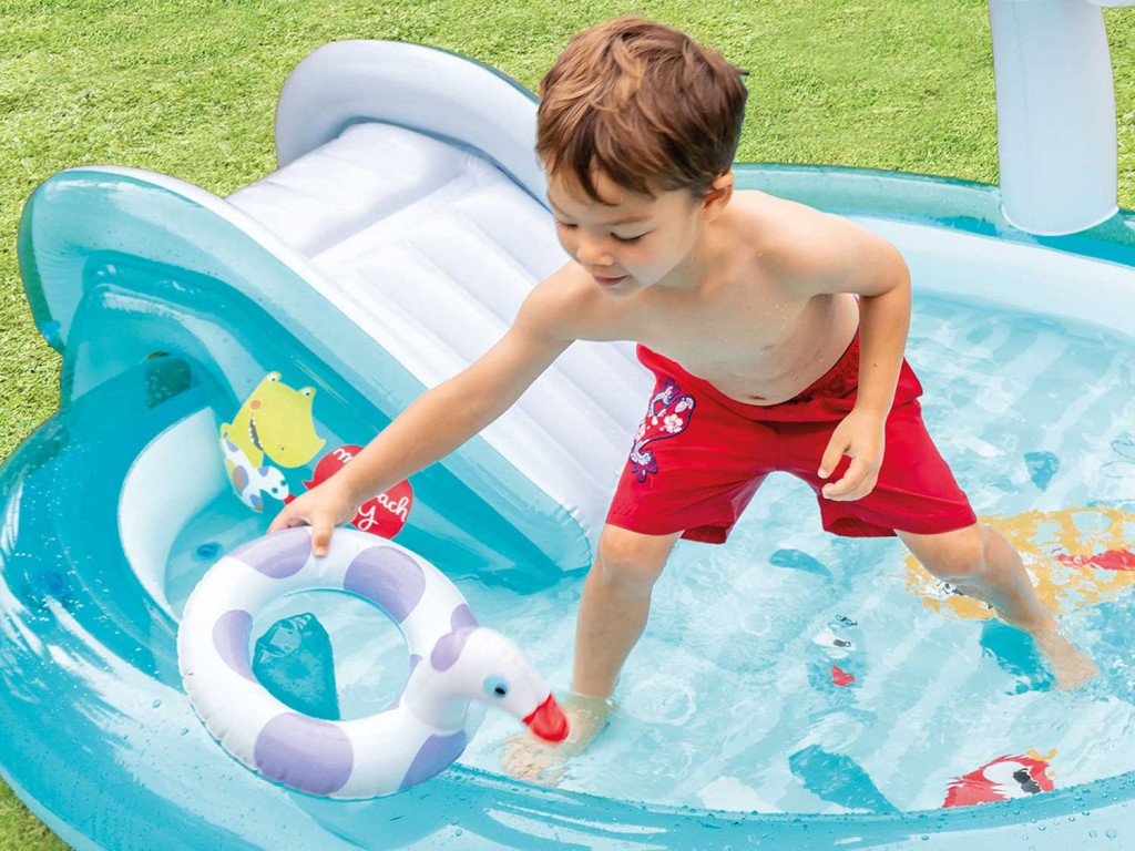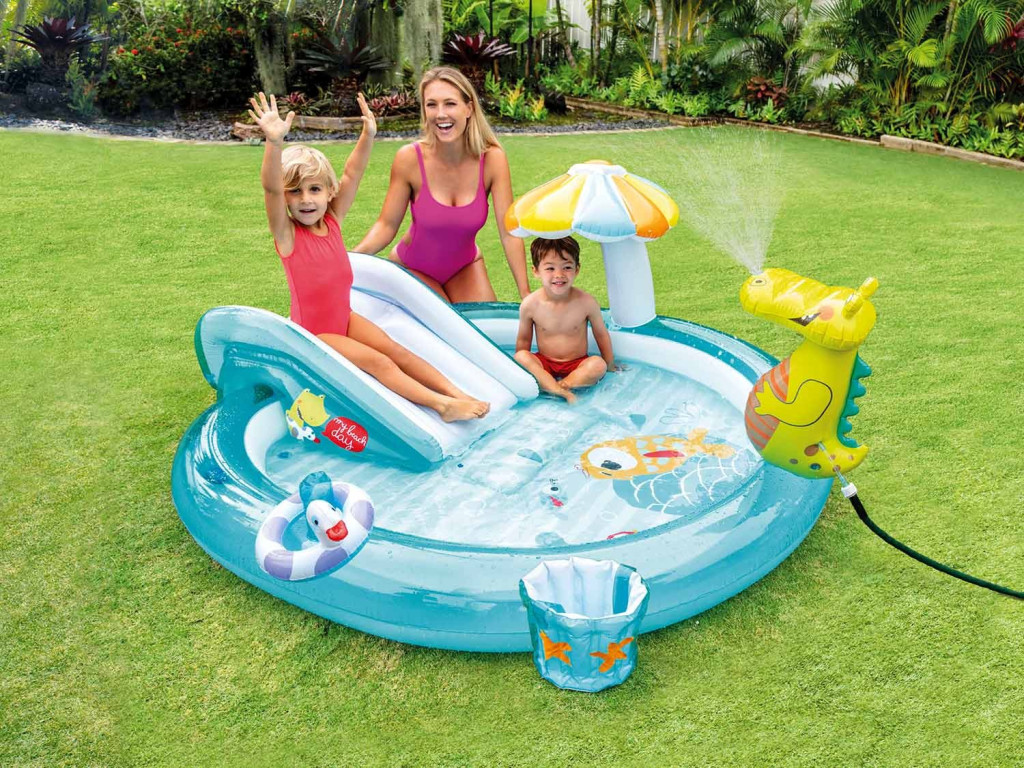 Vízi játszótér Krokodil 201 x 170 x 84 cm INTEX 57165 Vízi szórakozás a saját kertedben! ? Tartsa boldoggá a gyerekeket ezzel a fantasztikus vízi játszótérrel. A krokodillas felfújható játszótér nem csak kerti aquaparkként, hanem száraz úszómedenceként is működik a hidegebb napokon. Minden színes elemnek köszönhetően a gyerekek többféle játéklehetőség közül választhatnak: vízbe csúszhatnak, medencében csobbanhatnak vagy gyűrűt dobhatnak. Ez a játszótér órákon át szórakoztatja őket. A felfújható játszótér 2 éven felüli gyermekek számára alkalmas, de a nagyobb gyerekeknek is örömet okoz. Az Intex gondoskodott arról, hogy minden gyerek biztonságosan használhassa energiáját és élvezhesse a vízi szórakozást. Főbb jellemzők: a színes megjelenés játékra ösztönöz; felfújható csúszda; puha felfújható leszállópad; felfújható gomba-ernyő? szórakozáshoz és a nap elleni védelemhez; szökőkút - krokodil? csak csatlakoztassa a kerti tömlőt; egy kacsa, amelyet felfújható rúdra kell dobni; horgász felfújható vödör; parafa az alján? a könnyű vízleadás érdekében; tartós bakelit 0,28 mm vastagsággal? sok évszakon át kitart, kopásálló; 2 év feletti gyerekeknek? szülői felügyelet mellett; maximális terhelés 54 kg; javítófolt mellékelve. Építés Úszómedence Vízi csúszda Leszálló párna Gomba-esernyő Dobó kacsa Krokodil - szökőkút Halász vödör Tartós oldalfalak Erős alsó Műszaki adatok: Méretek: 201 x 170 x 84 cm Vízszint magasság: 12 cm Anyaga: PVC PVC vastagság: 0,28 mm Ajánlott életkor: 2 év felett Javító folt: mellékelve