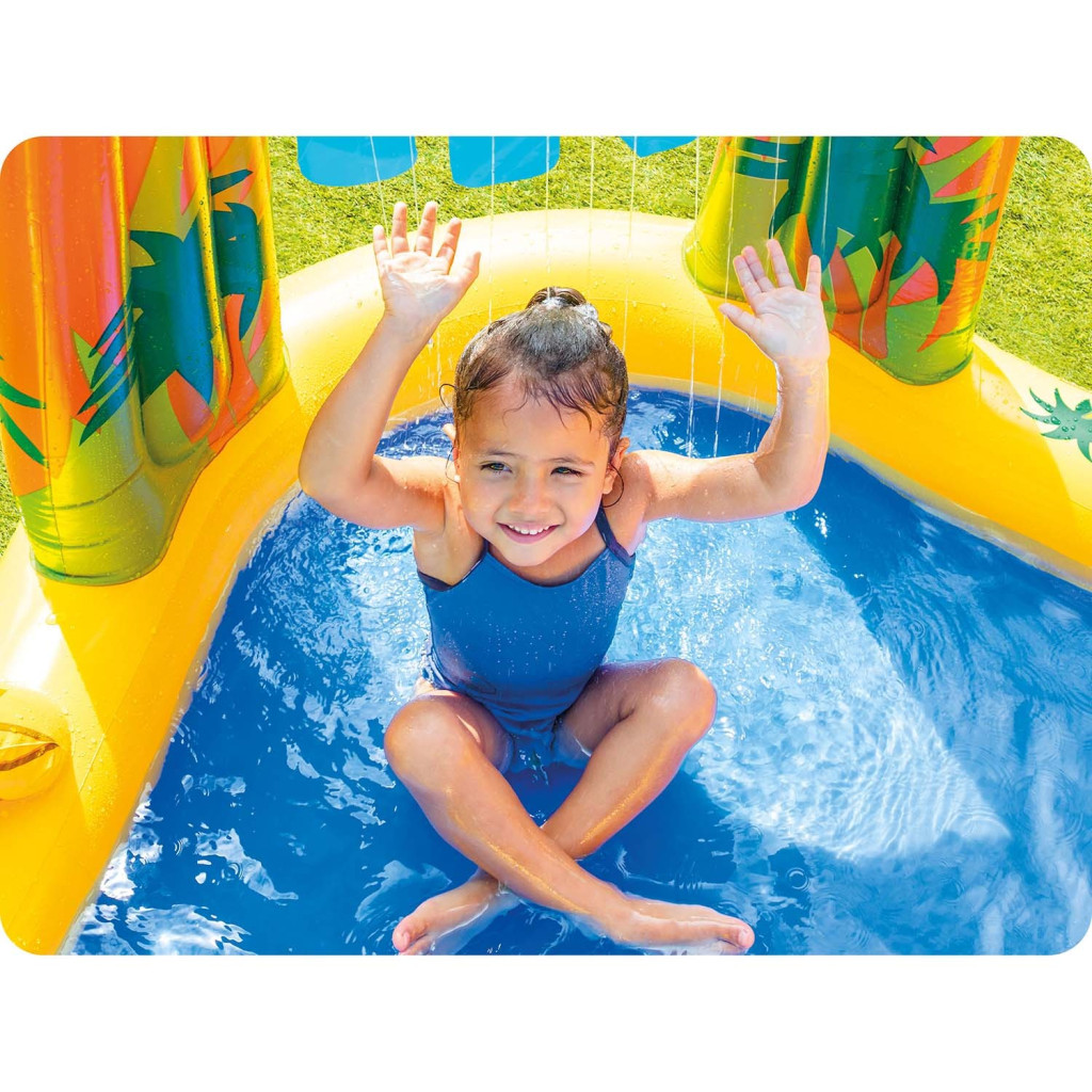 Dinoszauruszok játszótér csúszdával 249 x 191 x 109 cm INTEX 57444 Az Intex Dinosaurs felfújható játszótér szórakoztató, melynek köszönhetően gyermekei aktívan a szabadban tölthetik szabadságukat. A játszótér méretei: 249 x 191 x 109 cm - elég nagy ahhoz, hogy a szomszédok gyermekeit napfényes szórakozásra hívja. Nincs esély az unalomra. Van egy szökőkútunk és egy pálmafánk is, amely vizet ereget Dinoszaurusz További látványosság egy nagy, felfújható dinoszaurusz, amely arra vár, hogy golyókkal etetni lehessen! A sok vízi szórakozási lehetőség miatt a gyerekek már nem félnek a hosszú távú hőségtől. Úszómedence A játszótéren egy nagy medence (kb. 16 cm vízmagasság) és egy felfújható csúszda található. Főbb jellemzők: felfújható csúszda szökőkút virág szökőkút dobások játéka 6 golyó javítófolt mellékelve leeresztő szelep Műszaki adatok: Méretek 249 x 191 x 109 cm PVC anyag PVC vastagság 0,28 mm Súlya 5,25 kg A medence kapacitása 310 liter Vízszint magasság 16 cm Maximális terhelés 81 kg Ajánlott életkor 2 éves kortól