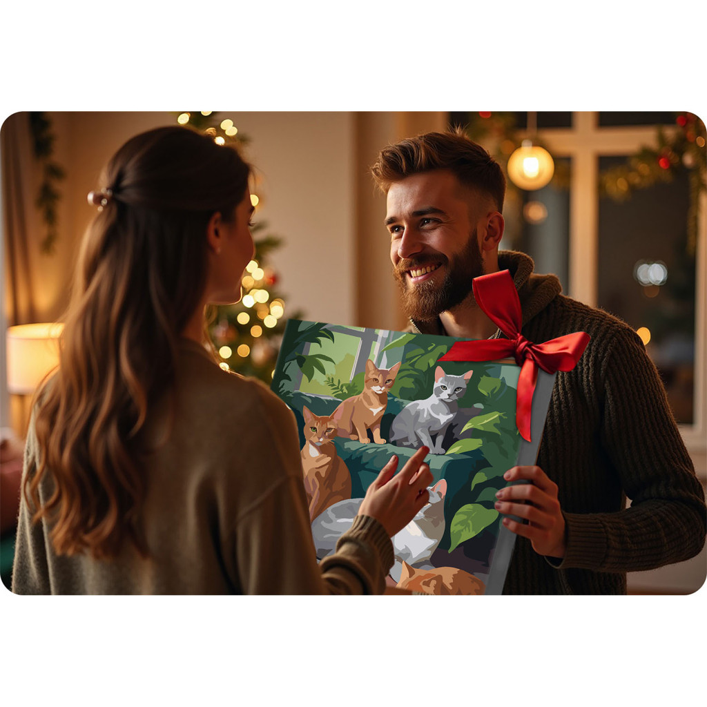 Számokkal festendő kép 40 x 50 cm Fedezze fel az alkotás örömét – tökéletes a művészek és a kreativitás szerelmeseinek! Minta: macskák Kiváló minőségű vászon hordágyon – tartós és festésre kész. Színes aláfestés finom mintával és élekkel – még kezdők számára is megkönnyíti a festést. Akár 30 átlátszatlan festék – intenzív színek a gyönyörű hatásért. 3 ecset egy készletben – INGYENES – különböző méretekben a precíz festéshez. Kampókészlet – lehetővé teszi a kész kép felakasztását. Gyönyörű minta és egyedi színek – fedezd fel a festés örömét! A vidám, színes dizájn nagyszerű választás kicsiknek és nagyoknak egyaránt, akik szeretnék felfedezni a festés örömét. Tökéletes, ha kreatív időt tölthet családjával, és egyedi, színekkel teli remekművet alkot! Nem kell művésznek lenned ahhoz, hogy szép alkotást készíts. Festés számokkal 3 lépésben: Festék párosítása számmal: A vászon minden területéhez hozzá van rendelve egy szám, amely megfelel a készlet egy adott festékszínének. Festés lépésről lépésre: töltse ki a megjelölt területeket a megfelelő festékkel, kezdve a nagyobb területekkel, majd haladva a részletekre. Csodálja meg az eredményeket: fokozatosan látni fogja, hogy alkotása formát és színt ölt. Csak kövesse a számokat, és a többi megteszi magától! Kreatív szórakozás az egész családnak! Tökéletes módja az együtt töltött időnek – pároknak, testvéreknek vagy egész családoknak. Együtt gyönyörű képeket hozhat létre, megoszthatja a színeket, nevethet és felejthetetlen kreativitási pillanatokat hozhat létre! Három kefe – tökéletesség minden részletében! 7 mm-es ecset: ideális nagy felületek festésére és a háttér gyors fedésére. 2 mm-es kefe: Tökéletes közepes méretű elemek precíz kitöltésére és egyenletes élek elérésére. 1 mm-es ecset: nélkülözhetetlen a legkisebb részletekhez és kifejező akcentusokhoz. A kreativitás generációkat köt össze – szórakozás gyerekeknek és felnőtteknek! A generációkat összekötő kreatív találkozók lehetővé teszik a gyermekek és felnőttek számára, hogy együtt alkossanak, felfedezzék a színeket és élvezzék az alkotó játék örömét. A készlet tartalma: Alapozott vászon hordágykeretre felvitt mintával. A4-es papírlap mintával. Festékkészlet. 3 kefe méretben: 1 mm, 2 mm és 7 mm. Kép felakasztására alkalmas kampókészlet. Tökéletes ajándék ötlet: A számokkal festett kép ideális ajándék - szettként az alkotás örömét adja, az elkészült, kézzel festett kép pedig egyedi dekorációvá válik. Ez egy személyes és eredeti ajándék, amely elkötelezettséget mutat, és mindenkiben különlegesnek érzi magát.