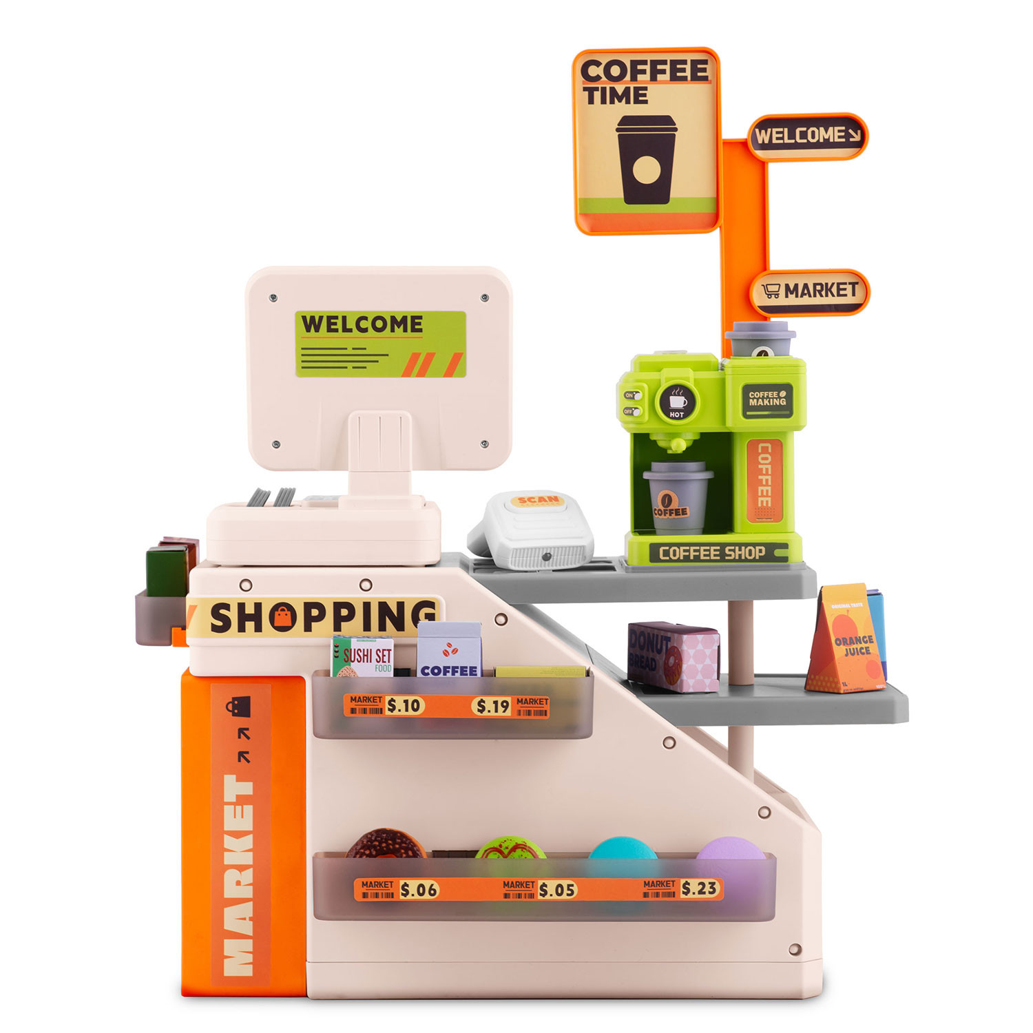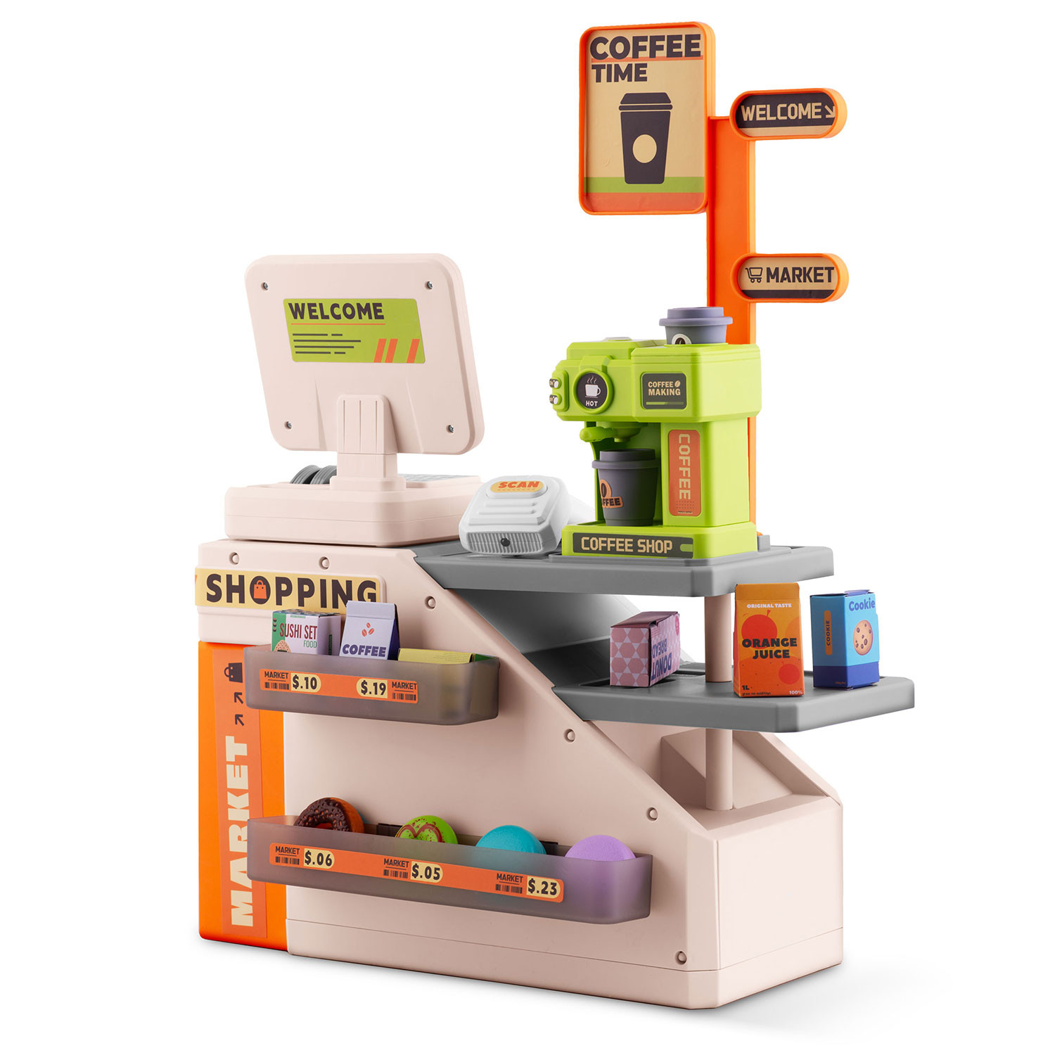 Az élénk színek serkentik a gyerekek látását, és a kiegészítők, mint a képernyővel ellátott pénztárgép, vonalkód-leolvasó, kávéfőző, hűtőszekrény, rengeteg termék, valamint játékbankjegyek és érmék sokáig elfoglalják gyermekét.