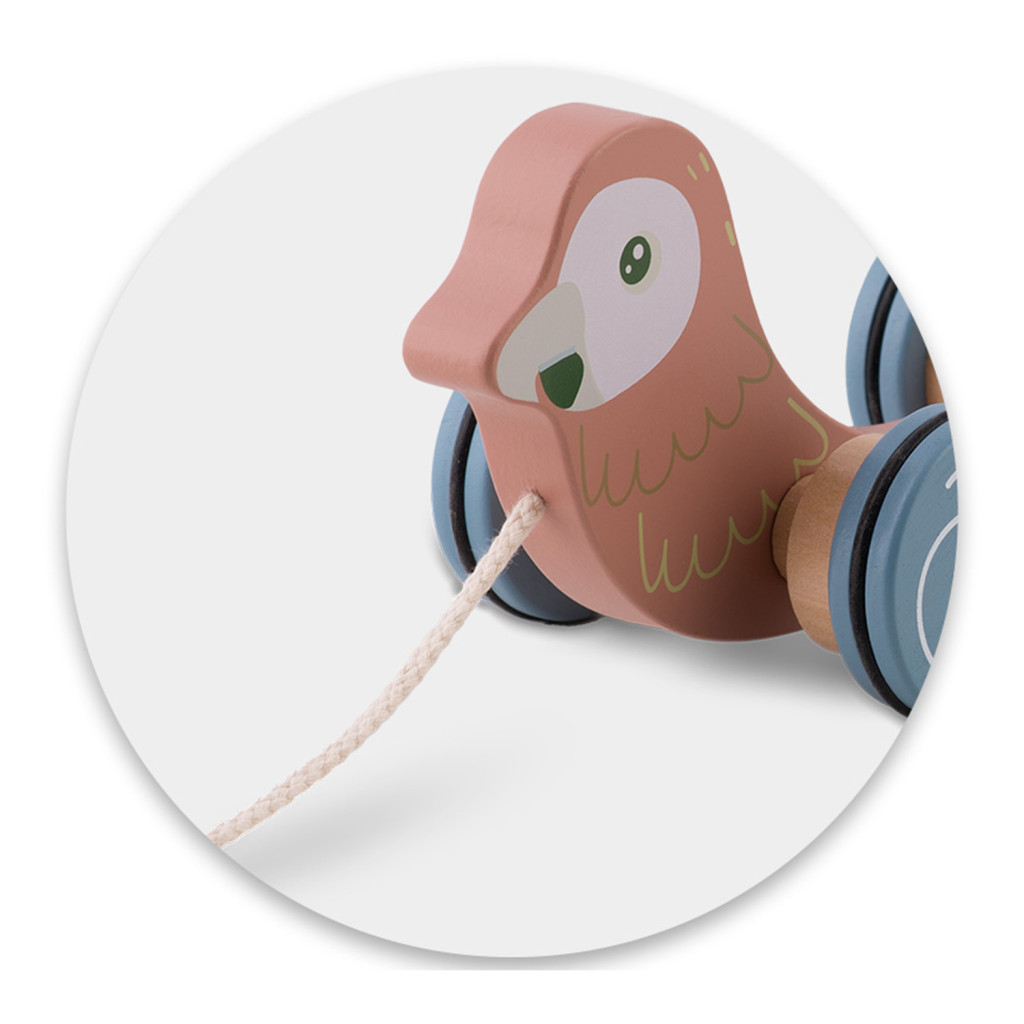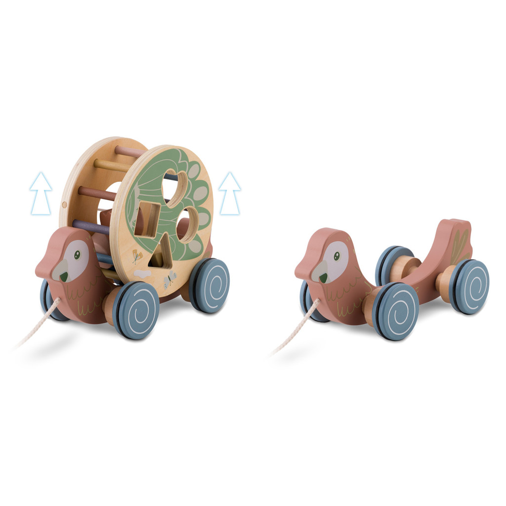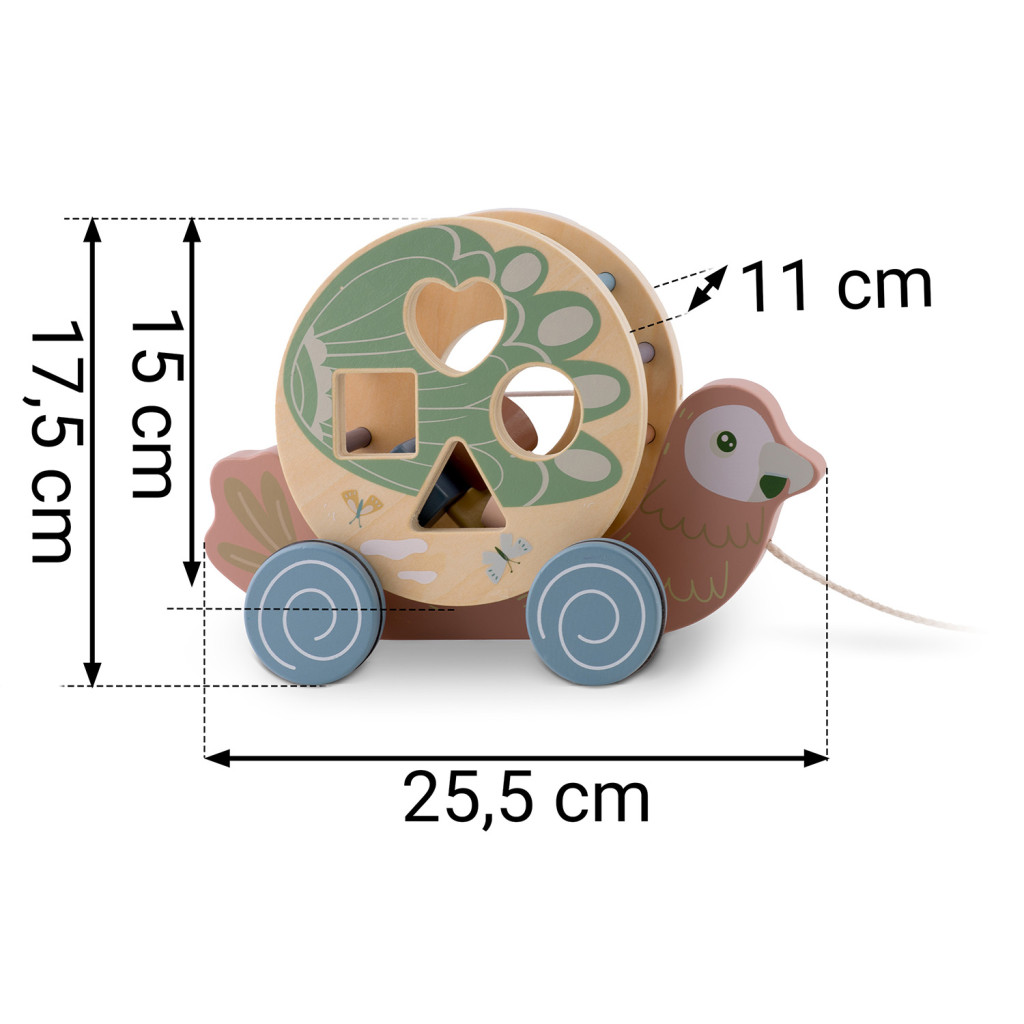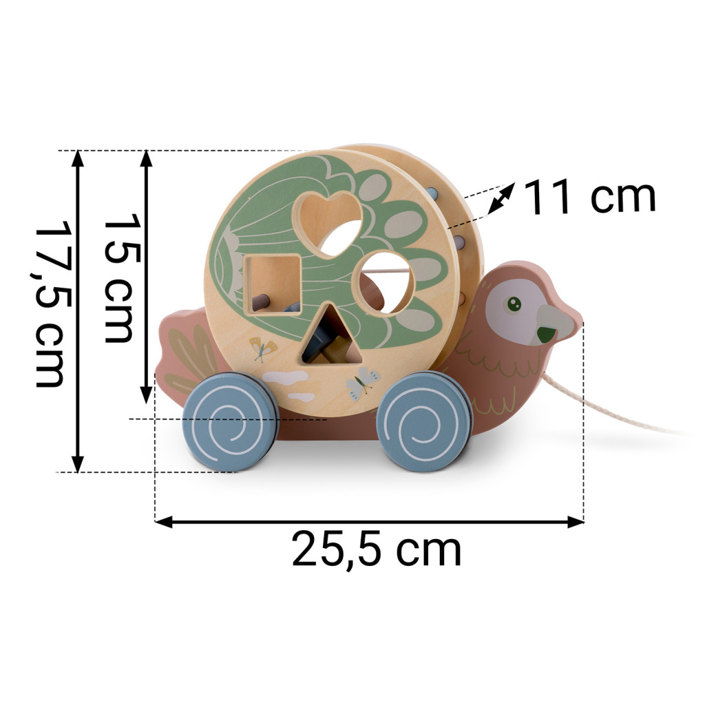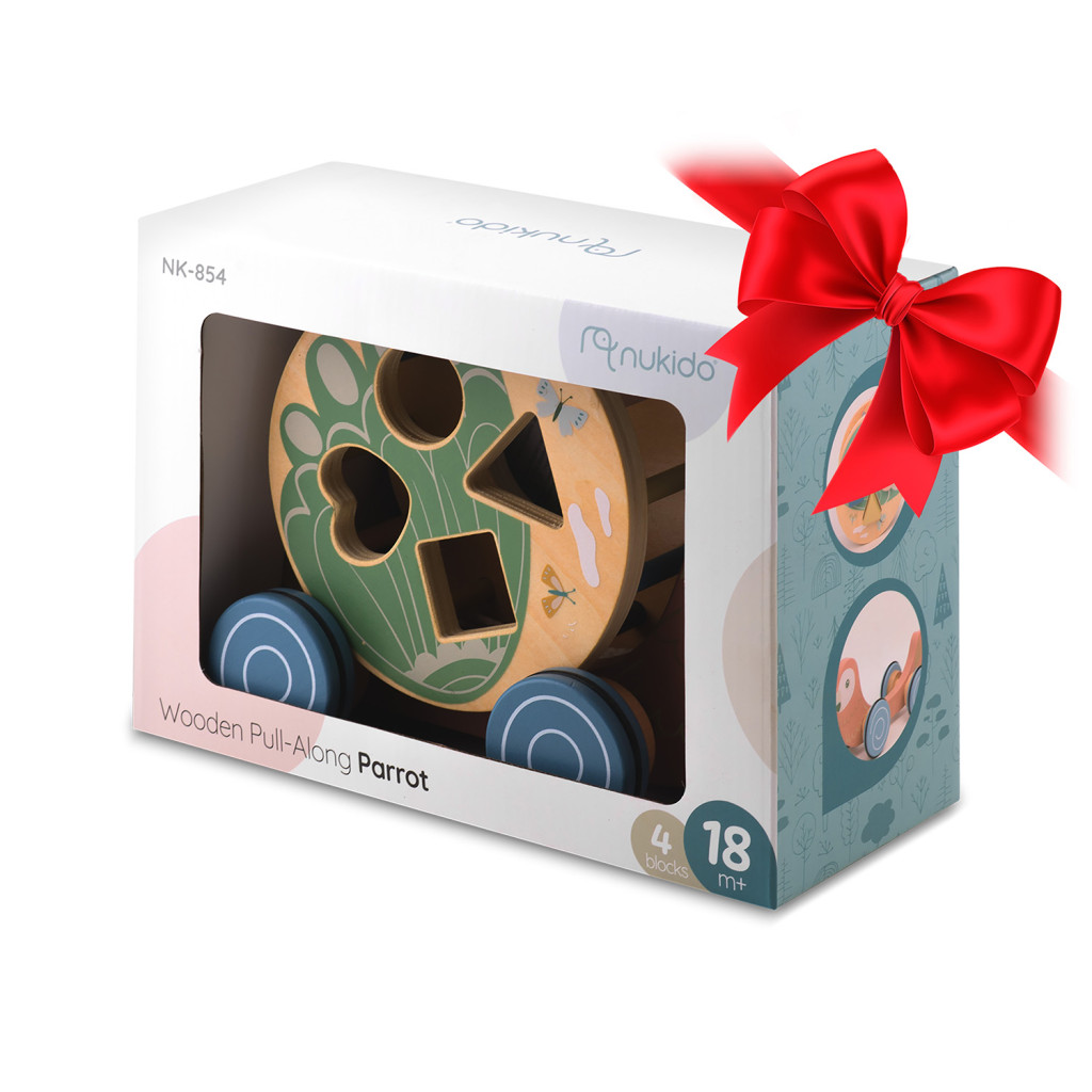 Fa húzós játék Papagáj Nukido: NK-854 ajándéknak tökéletes, a biztonságot az EN tanúsítványok garantálják. ⭐ Finommotorika fejlesztése: A húzó papagáj forgó válogatóval a hátán játékra és az ok-okozati események feltárására ösztönöz. ⭐ Érzékszervi stimuláció: Serkenti a baba érzékszerveit. Ennek a játéknak a felfedezése örömmel és fejlődéssel teli időtöltést biztosít kicsijének. ⭐ Montessori inspiráció: A Montessori elvekből ihletet merítve játékunk támogatja az aktív, érzékszervi alapú tanulást. ⭐⭐⭐⭐⭐ Természetes fából készült játékok a Nukido-tól: Tartósság és prémium minőség – A természetes fából készült játékok tartósak és ellenállnak a sérüléseknek, ami azt jelenti, hogy évekig használhatók. Masszív felépítésük biztosítja a biztonságot és a megbízhatóságot, ami a szülők és a gyermekek elégedettségét jelenti. Elegancia és minimalizmus – Az élénk, visszafogott színű játékok tökéletesen illeszkednek a modern, minimalista belső terekbe. A finom színek és a forma egyszerűsége segíti a gyermek fejlődését elősegítő esztétikus és nyugodt környezet kialakítását. Ha egy zsinór meghúzza, a játék elkezd gurulni, a válogató forog, és a játékok enyhén zörögnek A játék húzása: a játék egy zsinórral van felszerelve, amely lehetővé teszi, hogy a gyermek végighúzza a talajon. Amikor a gyermek húzza a játékot, a kerekek forogni kezdenek, ami a benne lévő mechanizmust működteti. Nevelési szempont: a válogató mozgás közbeni forgatása meglepetést és szórakozást ad, miközben megtanítja a gyermeket a mozgás és az okozat közötti ok-okozati összefüggésre. Ez a játék többfunkciós, 2 független elemből áll: Felhúzható papagáj: kerekeken lévő fából készült papagáj, amelyet a gyerek madzaggal húzhat. Tökéletes a finommotorika fejlesztésére. Tömbválogató: levehető a papagájról és külön játékként használható. Lehetővé teszi gyermeke számára, hogy megtanulja felismerni a formákat és a színeket azáltal, hogy a blokkokat a válogató lyukaihoz illeszti. A képzelet és a kreativitás serkentése: A játék támogatja a formák és színek felismerésének elsajátítását. A gyerekek megtanulják a formákat a megfelelő helyekhez igazítani, ami fejleszti kognitív képességeiket és vizuális észlelésüket. Az élénk, pasztell színek vizuálisan vonzóak, és befolyásolhatják a gyermek esztétikai érzékenységének kialakulását. A forgó számlap kihívást és újítást ad a hagyományos formaválogató játéknak. A gyermeknek nemcsak a formához kell igazítania, hanem a tárcsát is el kell forgatnia, hogy megtalálja a megfelelő lyukat, ami hozzájárulhat a jobb tervezési és problémamegoldó készségekhez. Az önálló játék támogatása: A játékot úgy tervezték, hogy a gyerekek önállóan játszhassanak vele, ami elősegíti a függetlenséget és egy pillanatnyi felüdülést ad a szülőknek. Ez a játék remek ajándékötlet Szórakozás és motoros fejlesztés a legkisebbeknek A fajáték kiválasztásával természetes anyagokból készült, a gyermek számára biztonságos ajándékot ad. Ideális választás azoknak a szülőknek, akik törődnek gyermekeik egészségével azáltal, hogy kerülik a potenciálisan káros műanyagokból készült termékeket. A fajátékok rendkívül strapabíróak, ami azt jelenti, hogy évekig kitartanak, családi ajándéktárgyakká válnak. Ez egy olyan ajándék, amely hosszú ideig elkísérheti a gyermeket, és nemzedékről nemzedékre öröklődik, érzelmi kötelékeket és emlékeket teremtve. Szórakozás és mozgásfejlesztés