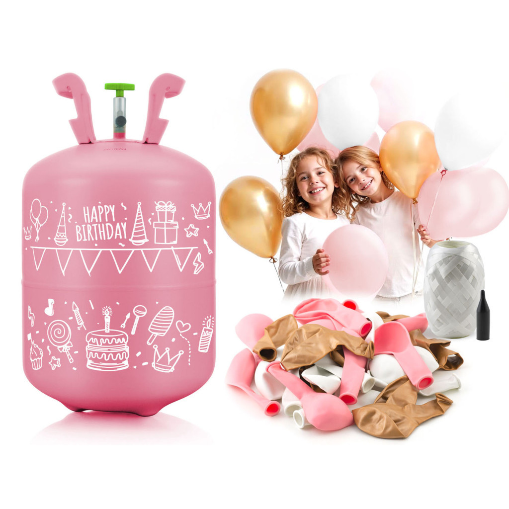 Hélium parti szett , 0,20 m3-es héliumpalack , rózsaszín és arany lufikkal , Ricokids szalaggal