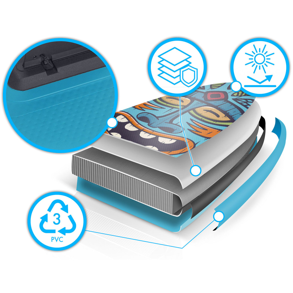 Tartalma: deszka, pumpa, lapát, póráz, kivehető nagy uszony, hátizsák, javítókészlet.