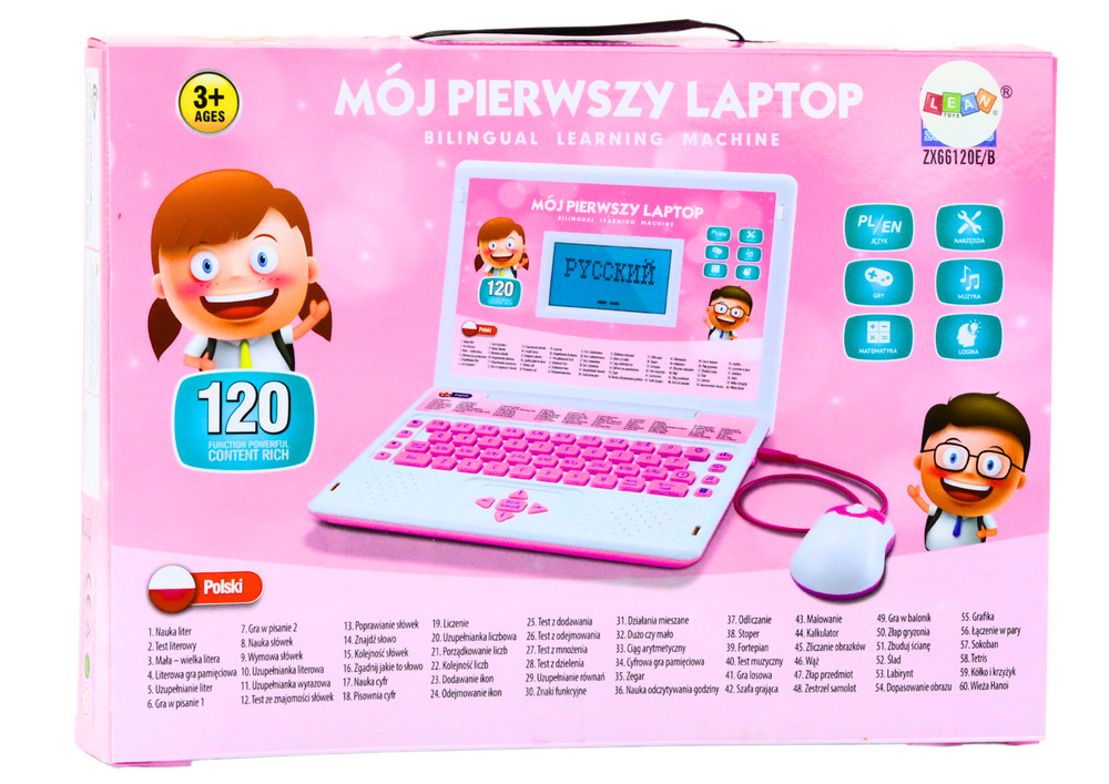 Oktató Laptop Interaktív 60 Funkció Két Nyelv KékA kék oktató laptop egy innovatív játék, amely hatékonyan ötvözi a tanulást a szórakozással, ösztönözve a gyerekeket tudásuk és készségeik bővítésére. A legfiatalabbak igényeit szem előtt tartva tervezték, gazdag oktató és interaktív funkciókat kínál, amelyek serkentik a gyermek intellektuális fejlődését és kreativitását. A laptop akár 60 különböző funkcióval is rendelkezik, amelyeknek köszönhetően a gyerekek számokat, matematikát tanulhatnak, és számos oktató játékot játszhatnak. Minden funkciót gondosan úgy terveztek, hogy támogassa a logikus gondolkodási készségek, a problémamegoldás, az alapvető matematikai fogalmak és a nyelvi helyesség fejlesztését. Az ilyen típusú játékok tökéletesek gyermeke iskolai kihívásokra való felkészítéséhez és ösztönzéséhez. Az oktató laptop egyik legnagyobb előnye a kétnyelvű funkcionalitás. A laptop lengyelül és angolul is kínál tanulást és szórakozást. Ennek köszönhetően a gyerekeknek lehetőségük van egy második nyelv alapjainak elsajátítására, ami különösen hasznos lehet későbbi oktatásukban. A kétnyelvű menük és programok lehetővé teszik a nyelvek közötti szabad váltást, ami megkönnyíti és hozzáférhetőbbé teszi a tanulást. Ezenkívül a laptophoz egér is tartozik, ami tovább növeli a játék interaktivitását. Az egér kis kezekhez lett kialakítva, ami kényelmet és könnyű használatot biztosít. A kék oktató laptop nemcsak funkcionális, hanem esztétikus is. Élénk színe vonzza a gyerekek tekintetét, és vonzóbbá teszi a tanulást. A masszív konstrukció és a tartós anyagok garantálják a hosszú távú használatot, ami rendkívül fontos a gyermekjátékok esetében. A laptopot 3 db 1,5 V-os AA elem táplálja, amelyek nem részei a készletnek. A laptop méretei: 24 cm x 18 cm x 4 cm A csomag mérete: 33 cm x 24 cm x 5 cm CE tanúsítvánnyal rendelkezik és megfelel az EN71 szabványnak. 3 év feletti gyermekek számára készült.