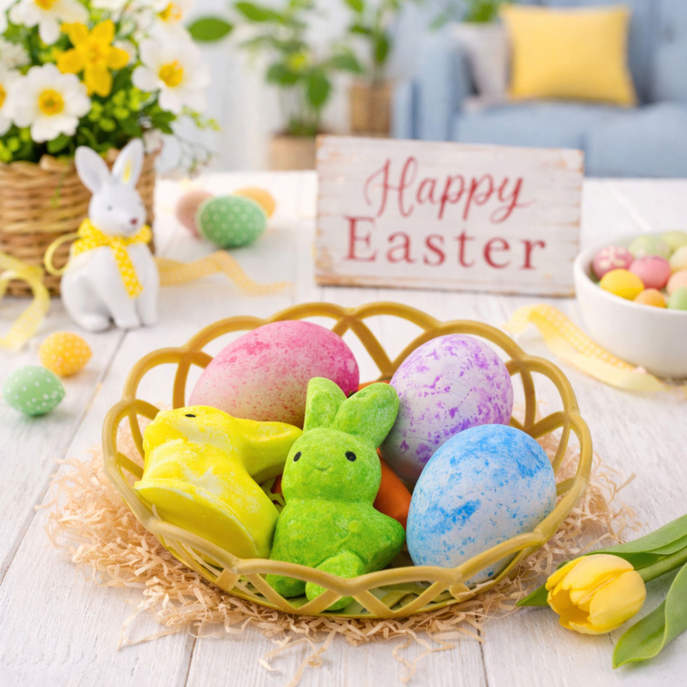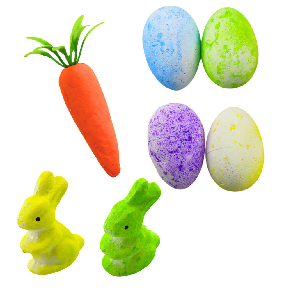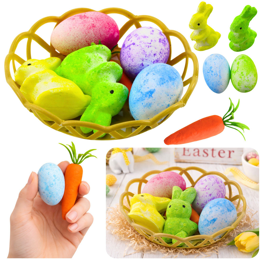 HÚSVÉTI DÍSZEK KOSÁRBAN NYUSZIK TOJÁSOK RÉPA 6 DB Teremtsen egyedi ünnepi hangulatot ezekkel a kosárba helyezett húsvéti dekorációkkal. Ez a bájos készlet különféle dekorációkat tartalmaz, amelyek tökéletesen kiegészítik a tavaszi virágkompozíciókat. Két imádnivaló nyuszit, három színes tojást és egy répát tartalmaz, kellemes húsvéti hangulatot kölcsönözve bármilyen dekorációnak. A pasztellszínek hangsúlyozzák az ünnep vidám hangulatát, míg a gondosan kidolgozott részletek elegáns és esztétikus megjelenést kölcsönöznek a készletnek. A díszek könnyű és tartós hungarocellből készültek, így hosszú élettartamot biztosítanak. A díszeket tartalmazó kosár strapabíró műanyagból készült, ami stabilitást biztosít és megkönnyíti a kiállítást. Elhelyezheti húsvéti asztalon, tálalószekrényen, polcon vagy koszorúban – sokoldalú kialakítása bármilyen ünnepi dekorációhoz illik. Kompakt méretének és gyönyörű esztétikájának köszönhetően ez a készlet tökéletes otthoni, irodábeli vagy éttermi használatra. Bájos húsvéti ajándék vagy egy nagyobb ünnepi dekoráció része lehet. A lágy pasztellárnyalatok és a hagyományos húsvéti motívumok időtlen kiegészítővé teszik, melegséget, örömet és tavaszi hangulatot hozva bármilyen helyiségbe. MŰSZAKI ADATOK: Dekorációs anyag: Hungarocell  Kosár átmérője: 15cm Kosár anyaga: Műanyag  Dekoráció színei: Sárga, zöld, kék, lila, rózsaszín, narancs  Motívumok: Nyuszik, tojások, sárgarépa  Használat: Asztaldísz, koszorúk, húsvéti díszek, polcdísz vagy ajándékba A SZETT TARTALMA:  2 hungarocell nyuszi (sárga és zöld) 3 hungarocell tojás (kék, lila, rózsaszín) 1 hungarocell sárgarépa Műanyag kosár a dekoráció alapjául