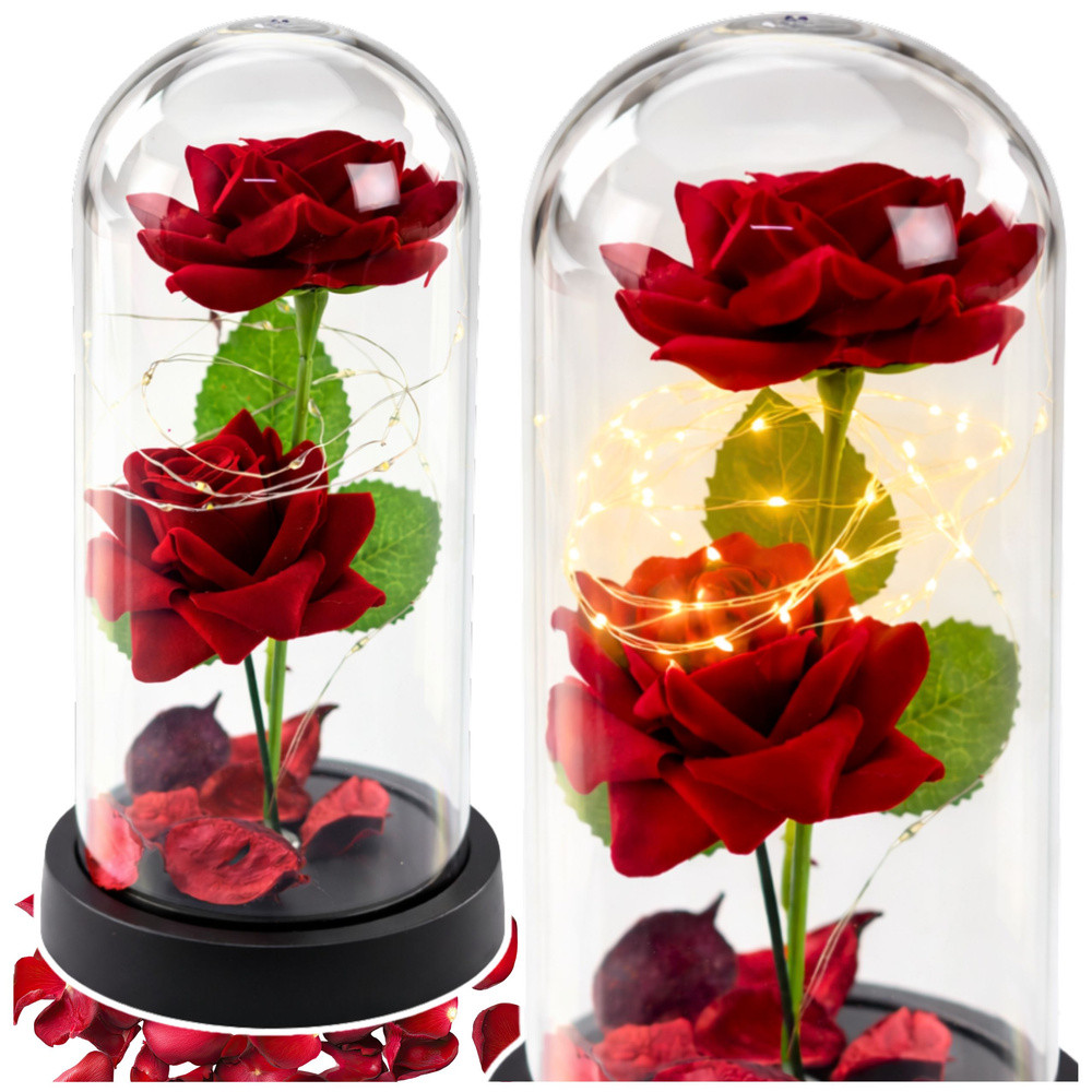 Örök 2 Rózsa Kupolában LED Világítással és Rózsaszirmokkal Piros 21x11cm