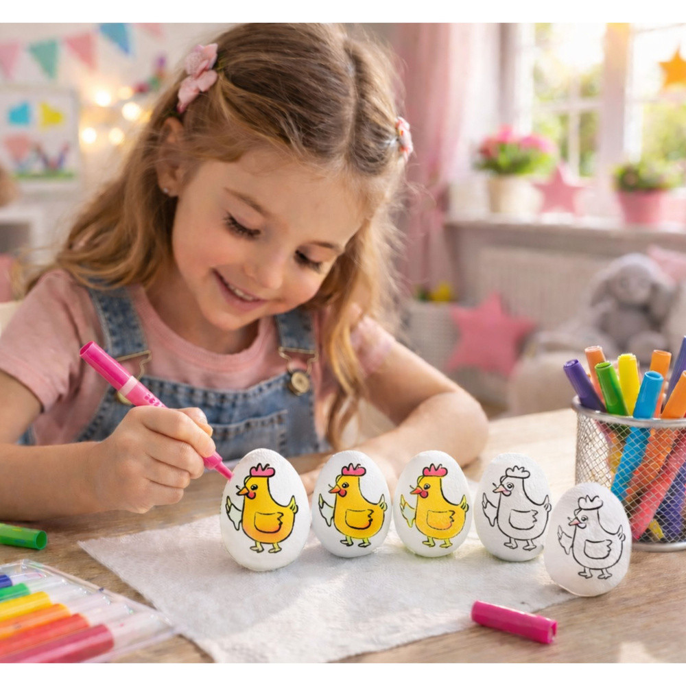 ⭐ POLISZTIROL TOJÁSOK FESTÉSHEZ, 6 DARAB FILTEREKKEL ⭐ Ez a polisztirol tojáskészlet tökéletes választás a gyerekeknek festéshez. A tojások sima felületűek, így készen állnak a festésre, díszítésre, aláírásra, vagy egyszerűen csak a hagyományos húsvéti tojások készítésére. Ezenkívül minden tojáson egy aranyos tyúk minta található, így a tevékenység még szórakoztatóbb! A készlet 6 polisztirol tojást és különböző színű filctollokat tartalmaz, így ideális otthoni, iskolai vagy óvodai játékhoz. ⭐ FŐBB TERMÉKJELLEMZŐK Tökéletes festéshez A tojások sima felülete készen áll a festésre, díszítésre vagy írásra, kreatív és oktató jellegű tevékenységet biztosítva a gyermekek számára. Fejleszti a motoros készségeket A tojások festése segít a gyerekeknek a kéz-szem koordináció gyakorlásában, javítja az ügyességet és a motoros kontrollt. Serkenti a képzeletet A gyerekek a tojásokat felhasználhatják saját minták elkészítésére, fejlesztve kreativitásukat és művészi kifejezésmódjukat. Sokoldalú felhasználás Tökéletes húsvéti dekorációhoz, valamint művészeti projektekhez és oktató jellegű játékokhoz gyerekeknek. ⭐ MŰSZAKI ADATOK Tojás magassága: 5,5 cm Tojás szélessége: 3,5 cm Tartalmazott filctoll színek: Sárga, Narancssárga, Piros, Kék, Rózsaszín, Zöld Tojás anyaga: Polisztirol ⭐ A KÉSZLET TARTALMA 6 db tyúk mintás polisztirol tojás 6 db filctoll (sárga, narancssárga, piros, kék, rózsaszín, zöld) TOVÁBBI ELŐNYÖK Vonzó dizájn A polisztirol tojások sima, fehér felülete, aranyos tyúk mintával, tökéletessé teszi őket a személyre szabáshoz és saját elképzelések szerinti díszítéshez. Gyermekek számára biztonságos Polisztirol tojásaink minden biztonsági szabványnak megfelelnek, így ideálisak a gyermekek játékához és kreativitásához. Tartós és könnyen használható A polisztirol anyag könnyű, tartós és könnyen kezelhető, így biztonságos és élvezetes festési élményt nyújt. Nagyszerű ajándékötlet Ez a készlet tökéletes húsvéti ajándék vagy oktatókészlet, amely minden gyermeket örömmel tölt el.