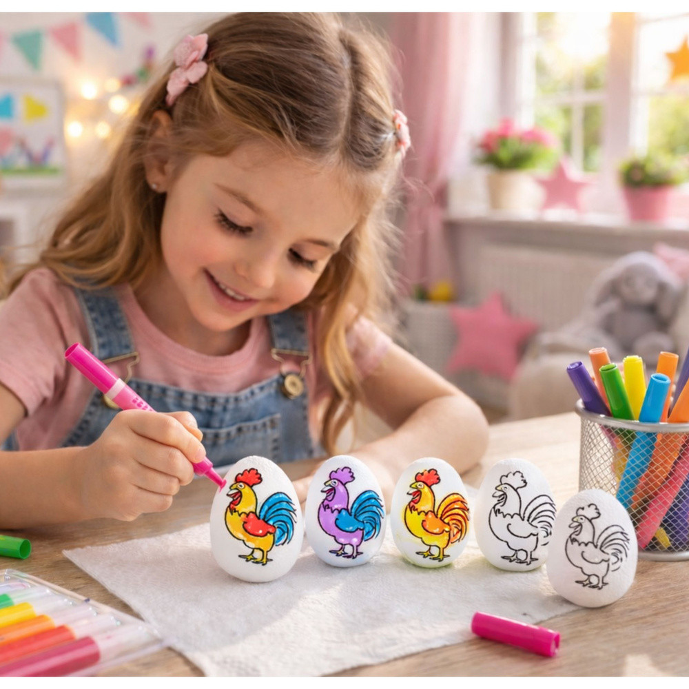 ⭐ 6 DARABOS HUNAPOLFÓLIA TOJÁSOK FESTÉSHEZ, FILTEREKKEL ⭐ Ez a hungarocell tojáskészlet tökéletes választás gyerekeknek festéshez. A tojások sima felületűek, így készen állnak festésre, díszítésre, írásra, vagy egyszerűen csak hagyományos húsvéti tojások készítésére. A készlet 6 db különböző színű hungarocell tojást és filctollokat tartalmaz, így ideális otthoni, iskolai vagy óvodai játékhoz. ⭐ A TERMÉK FŐBB JELLEMZŐI Tökéletes festéshez A tojások sima felülete készen áll festésre, díszítésre vagy írásra, így kreatív és oktató jellegű tevékenység a gyermekek számára. Fejleszti a motoros készségeket A tojások festése segít a gyerekeknek a kéz-szem koordináció gyakorlásában, javítja a kézügyességet és a motoros kontrollt. Serkenti a képzeletet A gyerekek a tojások segítségével saját mintákat készíthetnek, fokozva kreativitásukat és művészi kifejezésmódjukat. Sokoldalúan felhasználható Tökéletes húsvéti dekorációkhoz, valamint kézműves projektekhez és oktató jellegű játékokhoz gyermekek számára. ⭐ MŰSZAKI ADATOK Tojás magassága: 5,5 cm Tojás szélessége: 3,5 cm A készletben található filctoll színei: sárga, narancssárga, piros, kék, rózsaszín és zöld Tojás anyaga: hungarocell ⭐ A KÉSZLET TARTALMA 6 hungarocell tojás 6 filctoll (sárga, narancssárga, piros, kék, rózsaszín, zöld) TOVÁBBI ELŐNYÖK Vonzó dizájn A hungarocell tojások sima, fehér felülete tökéletessé teszi őket a személyre szabáshoz és a saját elképzelések szerinti díszítéshez. Gyermekek számára biztonságos Hungarocell tojásaink minden biztonsági szabványnak megfelelnek, így ideálisak a gyermekek játékához és kreativitásához. Tartós és könnyen használható A hungarocell anyag könnyű, tartós és könnyen kezelhető, így biztonságos és élvezetes festési tevékenységeket biztosít. Nagyszerű ajándékötlet A készlet ideális húsvéti ajándék vagy oktatókészlet, amely minden gyermeket örömmel tölt el.