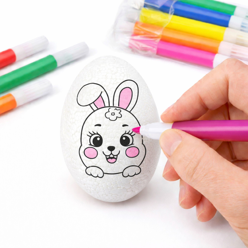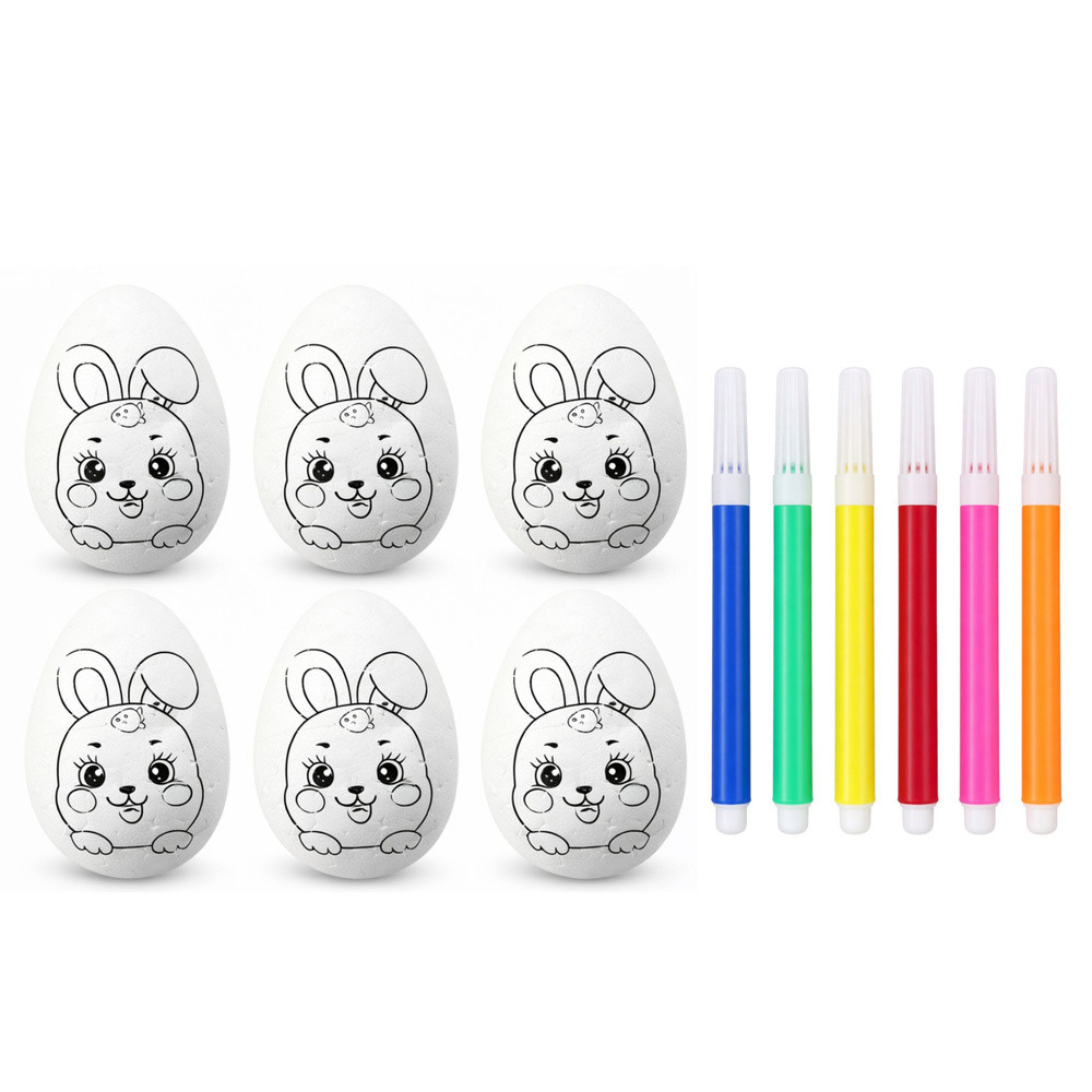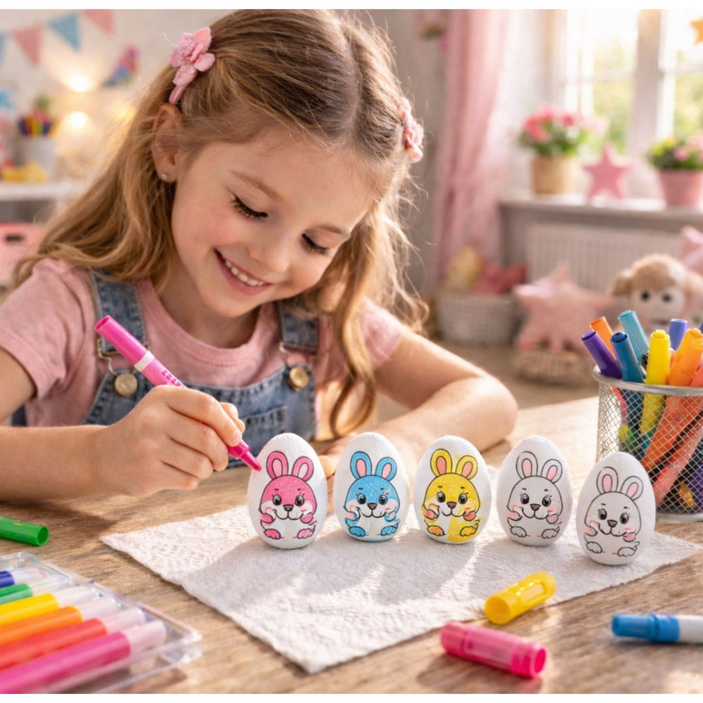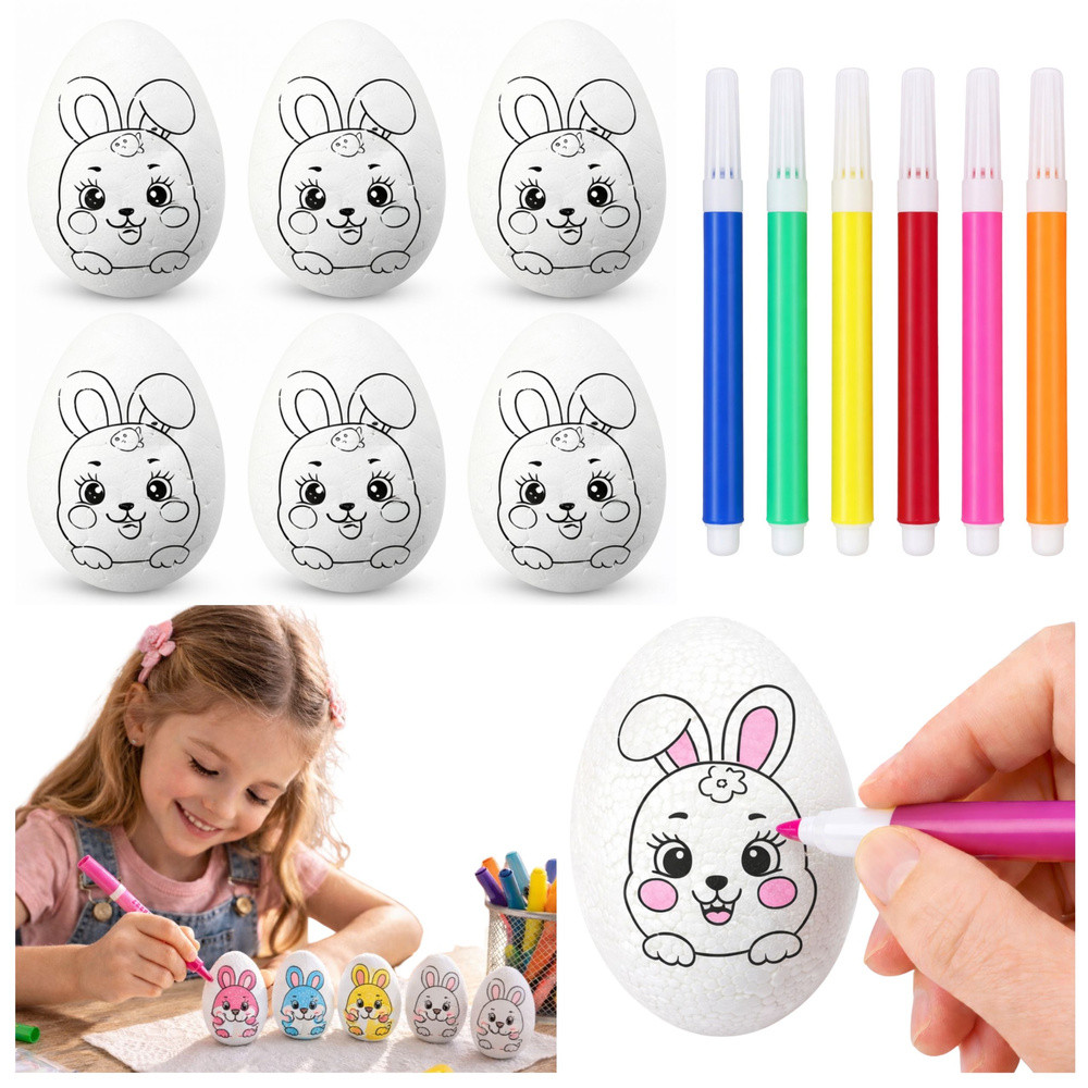 ⭐  POLISZTIROL TOJÁSOK FESTÉSHEZ – 6 DARAB FILTEREKKEL  ⭐ Ez a polisztirol tojáskészlet tökéletes választás gyerekeknek festéshez. A tojások sima felületűek, így készen állnak festésre, díszítésre, írásra, vagy egyszerűen csak a hagyományos húsvéti tojások készítésére. Ezenkívül minden tojás egy aranyos nyuszi mintával rendelkezik, így a tevékenység még szórakoztatóbb! A készlet 6 polisztirol tojást és filctollokat tartalmaz különböző színekben, így ideális otthoni, iskolai vagy óvodai játékhoz. ⭐  FŐBB TERMÉKJELLEMZŐK   Tökéletes festéshez A tojások sima felülete készen áll festésre, díszítésre vagy írásra, így kreatív és oktató jellegű tevékenység a gyerekek számára.   Fejleszti a motoros készségeket A tojások festése segít a gyerekeknek a kéz-szem koordináció gyakorlásában, javítja a kézügyességet és a motoros kontrollt.   Serkenti a képzeletet A gyerekek a tojásokat felhasználhatják saját minták elkészítésére, elősegítve a kreativitást és a művészi kifejezést.   Sokoldalú felhasználás Ideális húsvéti dekorációkhoz, valamint művészeti projektekhez és oktató jellegű játékokhoz gyerekeknek. ⭐  SPECIFIKÁCIÓK Tojás magassága:  5,5 cm Tojás szélessége:  3,5 cm Tartalmazott filctoll színek:  Sárga, Narancssárga, Piros, Kék, Rózsaszín, Zöld Tojás anyaga:  Polisztirol ⭐  KÉSZLET TARTALMA 6 db nyuszi mintás polisztirol tojás 6 db nyuszi mintás filctoll (sárga, narancssárga, piros, kék, rózsaszín, zöld) TOVÁBBI ELŐNYÖK   Vonzó dizájn A polisztirol tojások sima, fehér felülete és bájos nyuszi mintája tökéletessé teszi őket a személyre szabáshoz és az egyéni elképzelések szerinti díszítéshez.   Gyermekek számára biztonságos Polisztirol tojásaink minden biztonsági szabványnak megfelelnek, így ideálisak a gyermekek játékához és kreativitásához.   Tartós és könnyen használható A polisztirol anyag könnyű, tartós és könnyen kezelhető, így biztonságos és élvezetes festési élményt biztosít.   Nagyszerű ajándékötlet Ez a készlet tökéletes húsvéti ajándék vagy oktatókészlet, amely minden gyermeknek örömet okoz.