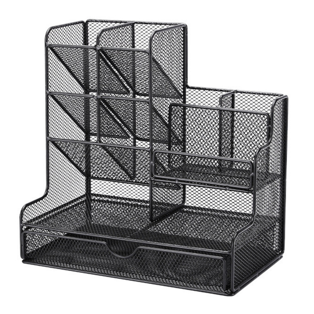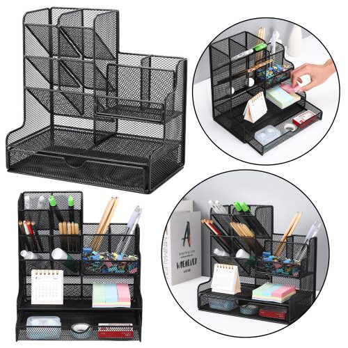 Irodaszer-rendező tároló, fém, fekete, modern asztali rendező. Ez a fém irodaszer-rendező praktikus és stílusos megoldás azok számára, akik értékelik a rendet és az esztétikát a munkahelyen. Könnyű, lakkozott fémből készült, a modern dizájnt ötvözi a funkcionalitással. Elegáns fekete színe bármilyen irodához illik, rendet és eleganciát visz abba.  A rendező előnyei:️ Tágasság és funkcionalitás - A tágas rekeszek lehetővé teszik az irodaszerek, például tollak, ceruzák, gemkapcsok, öntapadós jegyzetek vagy egyéb apróságok kényelmes tárolását. Ennek köszönhetően minden kéznél van, és a leggyakrabban használt dolgok könnyen elérhetők.️ Stílusos megjelenés - Az elegáns fekete szín és hálós szerkezet modern és professzionális megjelenést kölcsönöz a szervezőnek, amely tökéletesen illeszkedik bármilyen irodai stílushoz, stílusos kiegészítője a munkaterületnek.️ Tartósság és stabilitás - A tömör fémszerkezet nagy tartósságot és stabilitást biztosít, aminek köszönhetően a szervező hosszú ideig szolgálni fog.️ Kompakt méretek - 25 cm x 25 cm x 19 cm méreteivel a szervező bármilyen asztalra elfér, anélkül, hogy túl sok helyet foglalna, miközben kényelmes tárolást biztosít a tartozékok számára.️ CE ​​tanúsítvány - A termék megfelel a biztonsági és minőségi előírásoknak, ami garantálja a teljesen biztonságos használatát. Specifikáció:Anyag: Fém, fekete lakkal bevont hálós szerkezetMéretek: 25 cm (szélesség) x 19 cm (mélység) x 25 cm (magasság)Rekeszek száma: 8 tágas rekesz irodai kellékek tárolásáraTanúsítvány: CE - a termék megfelel a biztonsági követelményeknekAlkalmazás: Ideális irodába, dolgozószobába és más olyan helyiségekbe, ahol az íróasztal rendszerezése kulcsfontosságú. Miért válassza ezt a szervezőt?️ Elegáns dizájn – A szervező modern megjelenése bármilyen munkaterületre illeszkedik, stílust és eleganciát visz abba.️ Funkcionalitás – A 8 rekesz könnyű hozzáférést biztosít a legfontosabb irodai kellékekhez, tágasságuk pedig lehetővé teszi még több apró tárgy tárolását.️ Tartósság és stabilitás – Fémhálóból készült, a szervező ellenáll a sérüléseknek, masszív szerkezete pedig hosszú élettartamot biztosít.️ Kényelmes tárolás – Kompakt méreteinek köszönhetően a szervező bármilyen asztalon elfér, helyet takarít meg, miközben lehetővé teszi a tér rendszerezését.Az irodaszer-rendező praktikus és elegáns kiegészítője az irodának, amely segít a munkaterület rendszerezésében. A fém konstrukció és a fekete szín stílust és rendet visz irodájába, miközben nagyfokú tartósságot biztosít.