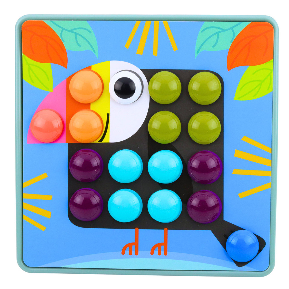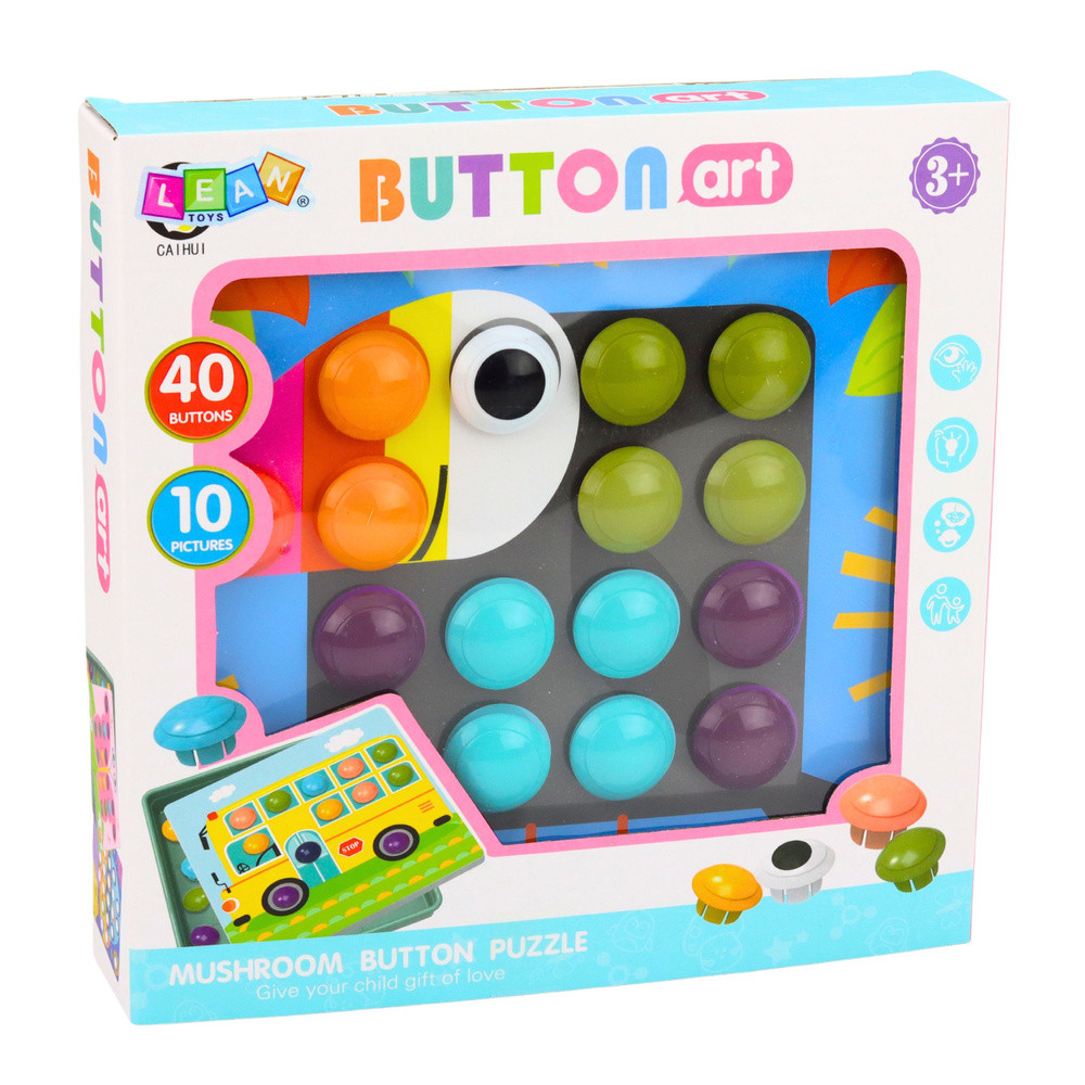 KREATÍV MOZAIK GOMBÁK OKTATÓ PUZZLEA Kreatív Mozaik Gombák egy oktatókészlet 3 éves kortól gyermekek számára, amely fejleszti a finommotoros készségeket, a koncentrációt és a képzeletet. A színes gombákkal színes kompozíciókat hozhatsz létre, és lemásolhatod a táblákon található illusztrációkat. A játék során a színes gombákat a kiválasztott tábla megfelelő helyeire kell illeszteni egy képpel. A gyerekek használhatják a mellékelt mintákat, vagy saját kreatív kompozíciókat is készíthetnek. A darabok behelyezése és eltávolítása fejleszti a precíziós mozgásokat, erősíti a finommotoros készségeket, és támogatja a kéz-szem koordináció fejlődését. A készlet 40 gombát, 10 táblát tartalmaz különböző motívumokat ábrázoló képekkel, két csipeszet a táblák stabil rögzítéséhez, valamint egy praktikus tálcát az összes darab tárolására. A tálca segít rendszerezni és biztonságban tartani a készletet játék után. Ez egy tökéletes ajándékötlet egy óvodásnak, aki játék közben tanulja meg a színek felismerését, fejleszti a türelmét és a kreativitását. SPECIFIKÁCIÓK: Játéktípus: Gomba mozaik, Oktató kirakó Megépíthető gombák száma: 40 Képtáblák száma: 10 További elemek: 2 csipesz, tárolótálca Funkció: Színek tanulása, finommotoros készségek fejlesztése, kéz-szem koordináció gyakorlása Anyag: Műanyag Csomag méretei: 26,5 x 26,5 x 5,5 cm A KÉSZLET TARTALMA: 40 megépíthető gomba 10 képtábla 2 csipesz Tálca